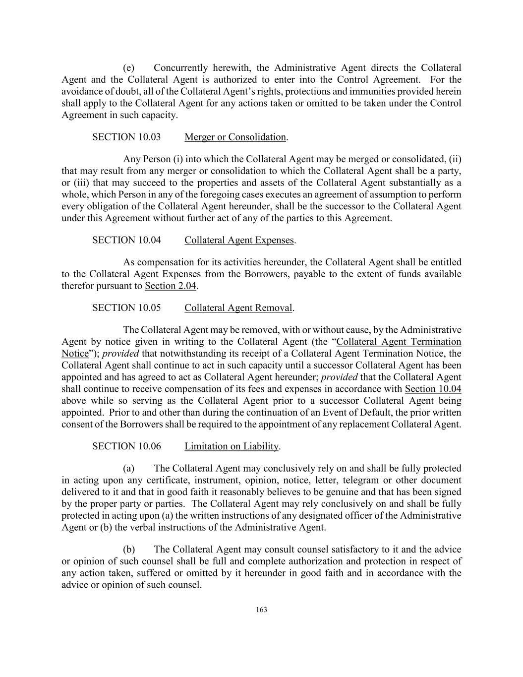 163 (e) Concurrently herewith, the Administrative Agent directs the Collateral Agent and the Collateral Agent is authorized to enter into the Control Agreement. For the avoidance of doubt, all of the Collateral Agent’s rights, protections and immunities provided herein shall apply to the Collateral Agent for any actions taken or omitted to be taken under the Control Agreement in such capacity. SECTION 10.03 Merger or Consolidation. Any Person (i) into which the Collateral Agent may be merged or consolidated, (ii) that may result from any merger or consolidation to which the Collateral Agent shall be a party, or (iii) that may succeed to the properties and assets of the Collateral Agent substantially as a whole, which Person in any of the foregoing cases executes an agreement of assumption to perform every obligation of the Collateral Agent hereunder, shall be the successor to the Collateral Agent under this Agreement without further act of any of the parties to this Agreement. SECTION 10.04 Collateral Agent Expenses. As compensation for its activities hereunder, the Collateral Agent shall be entitled to the Collateral Agent Expenses from the Borrowers, payable to the extent of funds available therefor pursuant to Section 2.04. SECTION 10.05 Collateral Agent Removal. The Collateral Agent may be removed, with or without cause, by the Administrative Agent by notice given in writing to the Collateral Agent (the “Collateral Agent Termination Notice”); provided that notwithstanding its receipt of a Collateral Agent Termination Notice, the Collateral Agent shall continue to act in such capacity until a successor Collateral Agent has been appointed and has agreed to act as Collateral Agent hereunder; provided that the Collateral Agent shall continue to receive compensation of its fees and expenses in accordance with Section 10.04 above while so serving as the Collateral Agent prior to a successor Collateral Agent being appointed. Prior to and other than during the continuation of an Event of Default, the prior written consent of the Borrowers shall be required to the appointment of any replacement Collateral Agent. SECTION 10.06 Limitation on Liability. (a) The Collateral Agent may conclusively rely on and shall be fully protected in acting upon any certificate, instrument, opinion, notice, letter, telegram or other document delivered to it and that in good faith it reasonably believes to be genuine and that has been signed by the proper party or parties. The Collateral Agent may rely conclusively on and shall be fully protected in acting upon (a) the written instructions of any designated officer of the Administrative Agent or (b) the verbal instructions of the Administrative Agent. (b) The Collateral Agent may consult counsel satisfactory to it and the advice or opinion of such counsel shall be full and complete authorization and protection in respect of any action taken, suffered or omitted by it hereunder in good faith and in accordance with the advice or opinion of such counsel.