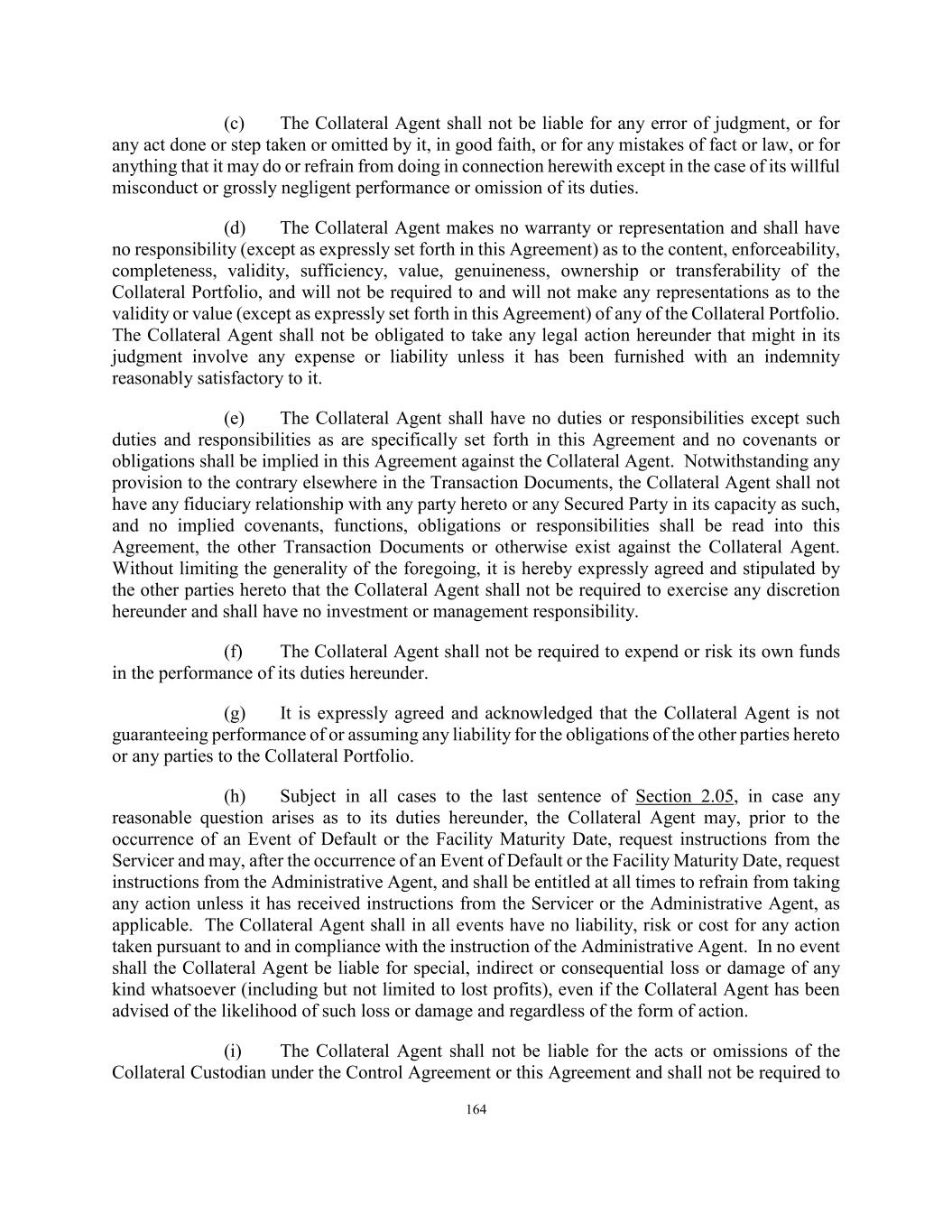 164 (c) The Collateral Agent shall not be liable for any error of judgment, or for any act done or step taken or omitted by it, in good faith, or for any mistakes of fact or law, or for anything that it may do or refrain from doing in connection herewith except in the case of its willful misconduct or grossly negligent performance or omission of its duties. (d) The Collateral Agent makes no warranty or representation and shall have no responsibility (except as expressly set forth in this Agreement) as to the content, enforceability, completeness, validity, sufficiency, value, genuineness, ownership or transferability of the Collateral Portfolio, and will not be required to and will not make any representations as to the validity or value (except as expressly set forth in this Agreement) of any of the Collateral Portfolio. The Collateral Agent shall not be obligated to take any legal action hereunder that might in its judgment involve any expense or liability unless it has been furnished with an indemnity reasonably satisfactory to it. (e) The Collateral Agent shall have no duties or responsibilities except such duties and responsibilities as are specifically set forth in this Agreement and no covenants or obligations shall be implied in this Agreement against the Collateral Agent. Notwithstanding any provision to the contrary elsewhere in the Transaction Documents, the Collateral Agent shall not have any fiduciary relationship with any party hereto or any Secured Party in its capacity as such, and no implied covenants, functions, obligations or responsibilities shall be read into this Agreement, the other Transaction Documents or otherwise exist against the Collateral Agent. Without limiting the generality of the foregoing, it is hereby expressly agreed and stipulated by the other parties hereto that the Collateral Agent shall not be required to exercise any discretion hereunder and shall have no investment or management responsibility. (f) The Collateral Agent shall not be required to expend or risk its own funds in the performance of its duties hereunder. (g) It is expressly agreed and acknowledged that the Collateral Agent is not guaranteeing performance of or assuming any liability for the obligations of the other parties hereto or any parties to the Collateral Portfolio. (h) Subject in all cases to the last sentence of Section 2.05, in case any reasonable question arises as to its duties hereunder, the Collateral Agent may, prior to the occurrence of an Event of Default or the Facility Maturity Date, request instructions from the Servicer and may, after the occurrence of an Event of Default or the Facility Maturity Date, request instructions from the Administrative Agent, and shall be entitled at all times to refrain from taking any action unless it has received instructions from the Servicer or the Administrative Agent, as applicable. The Collateral Agent shall in all events have no liability, risk or cost for any action taken pursuant to and in compliance with the instruction of the Administrative Agent. In no event shall the Collateral Agent be liable for special, indirect or consequential loss or damage of any kind whatsoever (including but not limited to lost profits), even if the Collateral Agent has been advised of the likelihood of such loss or damage and regardless of the form of action. (i) The Collateral Agent shall not be liable for the acts or omissions of the Collateral Custodian under the Control Agreement or this Agreement and shall not be required to