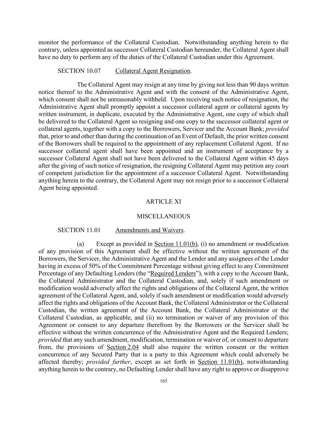165 monitor the performance of the Collateral Custodian. Notwithstanding anything herein to the contrary, unless appointed as successor Collateral Custodian hereunder, the Collateral Agent shall have no duty to perform any of the duties of the Collateral Custodian under this Agreement. SECTION 10.07 Collateral Agent Resignation. The Collateral Agent may resign at any time by giving not less than 90 days written notice thereof to the Administrative Agent and with the consent of the Administrative Agent, which consent shall not be unreasonably withheld. Upon receiving such notice of resignation, the Administrative Agent shall promptly appoint a successor collateral agent or collateral agents by written instrument, in duplicate, executed by the Administrative Agent, one copy of which shall be delivered to the Collateral Agent so resigning and one copy to the successor collateral agent or collateral agents, together with a copy to the Borrowers, Servicer and the Account Bank; provided that, prior to and other than during the continuation of an Event of Default, the prior written consent of the Borrowers shall be required to the appointment of any replacement Collateral Agent. If no successor collateral agent shall have been appointed and an instrument of acceptance by a successor Collateral Agent shall not have been delivered to the Collateral Agent within 45 days after the giving of such notice of resignation, the resigning Collateral Agent may petition any court of competent jurisdiction for the appointment of a successor Collateral Agent. Notwithstanding anything herein to the contrary, the Collateral Agent may not resign prior to a successor Collateral Agent being appointed. ARTICLE XI MISCELLANEOUS SECTION 11.01 Amendments and Waivers. (a) Except as provided in Section 11.01(b), (i) no amendment or modification of any provision of this Agreement shall be effective without the written agreement of the Borrowers, the Servicer, the Administrative Agent and the Lender and any assignees of the Lender having in excess of 50% of the Commitment Percentage without giving effect to any Commitment Percentage of any Defaulting Lenders (the “Required Lenders”), with a copy to the Account Bank, the Collateral Administrator and the Collateral Custodian, and, solely if such amendment or modification would adversely affect the rights and obligations of the Collateral Agent, the written agreement of the Collateral Agent, and, solely if such amendment or modification would adversely affect the rights and obligations of the Account Bank, the Collateral Administrator or the Collateral Custodian, the written agreement of the Account Bank, the Collateral Administrator or the Collateral Custodian, as applicable, and (ii) no termination or waiver of any provision of this Agreement or consent to any departure therefrom by the Borrowers or the Servicer shall be effective without the written concurrence of the Administrative Agent and the Required Lenders; provided that any such amendment, modification, termination or waiver of, or consent to departure from, the provisions of Section 2.04 shall also require the written consent or the written concurrence of any Secured Party that is a party to this Agreement which could adversely be affected thereby; provided further, except as set forth in Section 11.01(b), notwithstanding anything herein to the contrary, no Defaulting Lender shall have any right to approve or disapprove