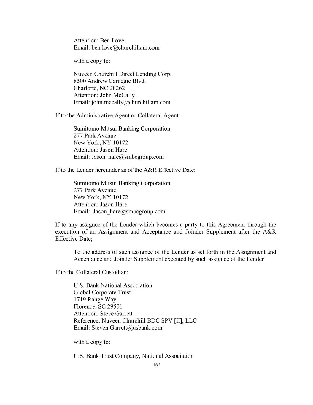 167 Attention: Ben Love Email: ben.love@churchillam.com with a copy to: Nuveen Churchill Direct Lending Corp. 8500 Andrew Carnegie Blvd. Charlotte, NC 28262 Attention: John McCally Email: john.mccally@churchillam.com If to the Administrative Agent or Collateral Agent: Sumitomo Mitsui Banking Corporation 277 Park Avenue New York, NY 10172 Attention: Jason Hare Email: Jason_hare@smbcgroup.com If to the Lender hereunder as of the A&R Effective Date: Sumitomo Mitsui Banking Corporation 277 Park Avenue New York, NY 10172 Attention: Jason Hare Email: Jason_hare@smbcgroup.com If to any assignee of the Lender which becomes a party to this Agreement through the execution of an Assignment and Acceptance and Joinder Supplement after the A&R Effective Date; To the address of such assignee of the Lender as set forth in the Assignment and Acceptance and Joinder Supplement executed by such assignee of the Lender If to the Collateral Custodian: U.S. Bank National Association Global Corporate Trust 1719 Range Way Florence, SC 29501 Attention: Steve Garrett Reference: Nuveen Churchill BDC SPV [II], LLC Email: Steven.Garrett@usbank.com with a copy to: U.S. Bank Trust Company, National Association