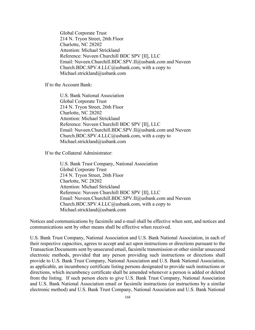 168 Global Corporate Trust 214 N. Tryon Street, 26th Floor Charlotte, NC 28202 Attention: Michael Strickland Reference: Nuveen Churchill BDC SPV [II], LLC Email: Nuveen.Churchill.BDC.SPV.II@usbank.com and Nuveen Church.BDC.SPV.4.LLC@usbank.com, with a copy to Michael.strickland@usbank.com If to the Account Bank: U.S. Bank National Association Global Corporate Trust 214 N. Tryon Street, 26th Floor Charlotte, NC 28202 Attention: Michael Strickland Reference: Nuveen Churchill BDC SPV [II], LLC Email: Nuveen.Churchill.BDC.SPV.II@usbank.com and Nuveen Church.BDC.SPV.4.LLC@usbank.com, with a copy to Michael.strickland@usbank.com If to the Collateral Administrator: U.S. Bank Trust Company, National Association Global Corporate Trust 214 N. Tryon Street, 26th Floor Charlotte, NC 28202 Attention: Michael Strickland Reference: Nuveen Churchill BDC SPV [II], LLC Email: Nuveen.Churchill.BDC.SPV.II@usbank.com and Nuveen Church.BDC.SPV.4.LLC@usbank.com, with a copy to Michael.strickland@usbank.com Notices and communications by facsimile and e-mail shall be effective when sent, and notices and communications sent by other means shall be effective when received. U.S. Bank Trust Company, National Association and U.S. Bank National Association, in each of their respective capacities, agrees to accept and act upon instructions or directions pursuant to the Transaction Documents sent by unsecured email, facsimile transmission or other similar unsecured electronic methods, provided that any person providing such instructions or directions shall provide to U.S. Bank Trust Company, National Association and U.S. Bank National Association, as applicable, an incumbency certificate listing persons designated to provide such instructions or directions, which incumbency certificate shall be amended whenever a person is added or deleted from the listing. If such person elects to give U.S. Bank Trust Company, National Association and U.S. Bank National Association email or facsimile instructions (or instructions by a similar electronic method) and U.S. Bank Trust Company, National Association and U.S. Bank National