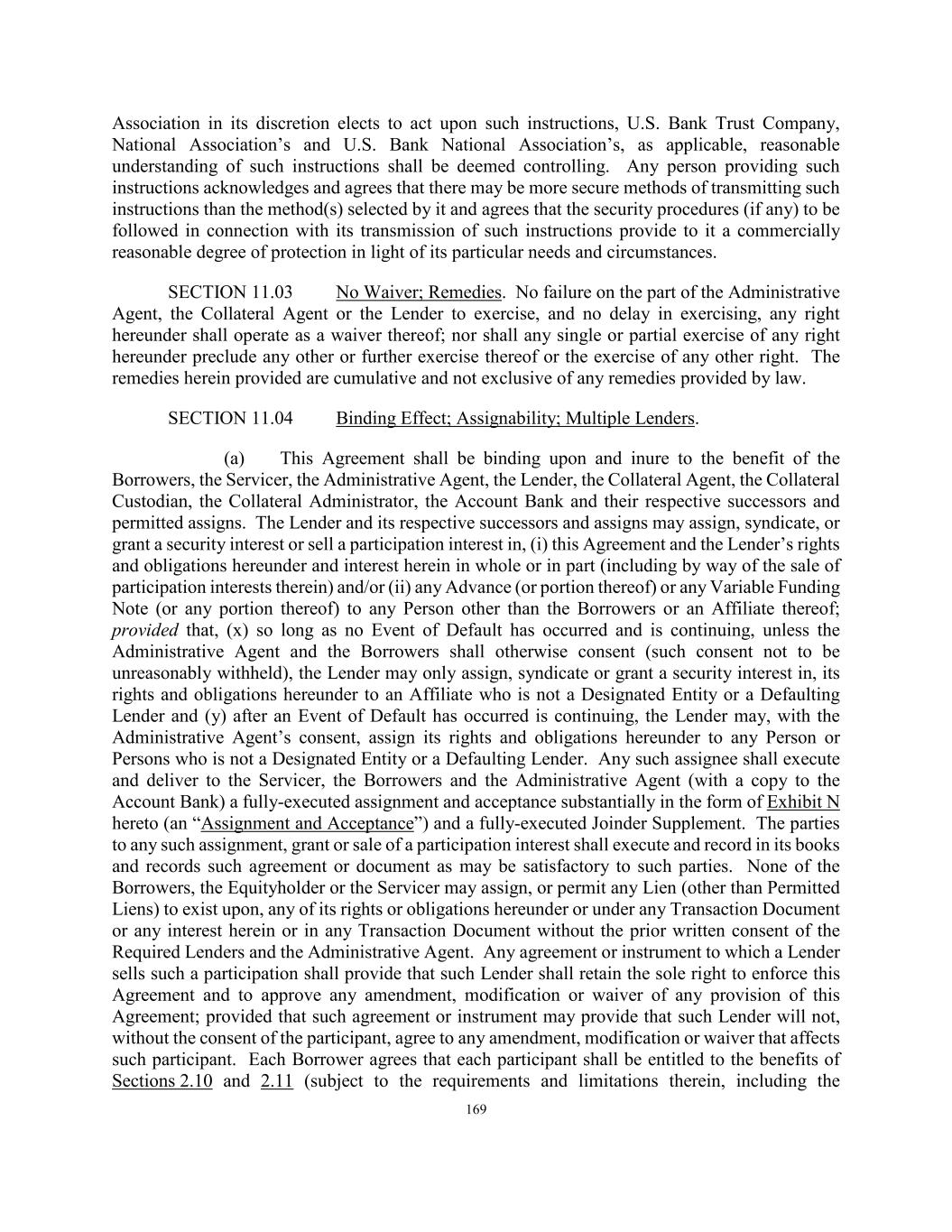 169 Association in its discretion elects to act upon such instructions, U.S. Bank Trust Company, National Association’s and U.S. Bank National Association’s, as applicable, reasonable understanding of such instructions shall be deemed controlling. Any person providing such instructions acknowledges and agrees that there may be more secure methods of transmitting such instructions than the method(s) selected by it and agrees that the security procedures (if any) to be followed in connection with its transmission of such instructions provide to it a commercially reasonable degree of protection in light of its particular needs and circumstances. SECTION 11.03 No Waiver; Remedies. No failure on the part of the Administrative Agent, the Collateral Agent or the Lender to exercise, and no delay in exercising, any right hereunder shall operate as a waiver thereof; nor shall any single or partial exercise of any right hereunder preclude any other or further exercise thereof or the exercise of any other right. The remedies herein provided are cumulative and not exclusive of any remedies provided by law. SECTION 11.04 Binding Effect; Assignability; Multiple Lenders. (a) This Agreement shall be binding upon and inure to the benefit of the Borrowers, the Servicer, the Administrative Agent, the Lender, the Collateral Agent, the Collateral Custodian, the Collateral Administrator, the Account Bank and their respective successors and permitted assigns. The Lender and its respective successors and assigns may assign, syndicate, or grant a security interest or sell a participation interest in, (i) this Agreement and the Lender’s rights and obligations hereunder and interest herein in whole or in part (including by way of the sale of participation interests therein) and/or (ii) any Advance (or portion thereof) or any Variable Funding Note (or any portion thereof) to any Person other than the Borrowers or an Affiliate thereof; provided that, (x) so long as no Event of Default has occurred and is continuing, unless the Administrative Agent and the Borrowers shall otherwise consent (such consent not to be unreasonably withheld), the Lender may only assign, syndicate or grant a security interest in, its rights and obligations hereunder to an Affiliate who is not a Designated Entity or a Defaulting Lender and (y) after an Event of Default has occurred is continuing, the Lender may, with the Administrative Agent’s consent, assign its rights and obligations hereunder to any Person or Persons who is not a Designated Entity or a Defaulting Lender. Any such assignee shall execute and deliver to the Servicer, the Borrowers and the Administrative Agent (with a copy to the Account Bank) a fully-executed assignment and acceptance substantially in the form of Exhibit N hereto (an “Assignment and Acceptance”) and a fully-executed Joinder Supplement. The parties to any such assignment, grant or sale of a participation interest shall execute and record in its books and records such agreement or document as may be satisfactory to such parties. None of the Borrowers, the Equityholder or the Servicer may assign, or permit any Lien (other than Permitted Liens) to exist upon, any of its rights or obligations hereunder or under any Transaction Document or any interest herein or in any Transaction Document without the prior written consent of the Required Lenders and the Administrative Agent. Any agreement or instrument to which a Lender sells such a participation shall provide that such Lender shall retain the sole right to enforce this Agreement and to approve any amendment, modification or waiver of any provision of this Agreement; provided that such agreement or instrument may provide that such Lender will not, without the consent of the participant, agree to any amendment, modification or waiver that affects such participant. Each Borrower agrees that each participant shall be entitled to the benefits of Sections 2.10 and 2.11 (subject to the requirements and limitations therein, including the
