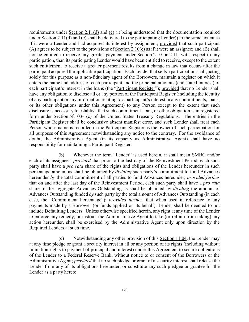170 requirements under Section 2.11(d) and (e) (it being understood that the documentation required under Section 2.11(d) and (e) shall be delivered to the participating Lender)) to the same extent as if it were a Lender and had acquired its interest by assignment; provided that such participant (A) agrees to be subject to the provisions of Section 2.10(e) as if it were an assignee; and (B) shall not be entitled to receive any greater payment under Section 2.10 or 2.11, with respect to any participation, than its participating Lender would have been entitled to receive, except to the extent such entitlement to receive a greater payment results from a change in law that occurs after the participant acquired the applicable participation. Each Lender that sells a participation shall, acting solely for this purpose as a non-fiduciary agent of the Borrowers, maintain a register on which it enters the name and address of each participant and the principal amounts (and stated interest) of each participant’s interest in the loans (the “Participant Register”); provided that no Lender shall have any obligation to disclose all or any portion of the Participant Register (including the identity of any participant or any information relating to a participant’s interest in any commitments, loans, or its other obligations under this Agreement) to any Person except to the extent that such disclosure is necessary to establish that such commitment, loan, or other obligation is in registered form under Section 5f.103-1(c) of the United States Treasury Regulations. The entries in the Participant Register shall be conclusive absent manifest error, and such Lender shall treat each Person whose name is recorded in the Participant Register as the owner of such participation for all purposes of this Agreement notwithstanding any notice to the contrary. For the avoidance of doubt, the Administrative Agent (in its capacity as Administrative Agent) shall have no responsibility for maintaining a Participant Register. (b) Whenever the term “Lender” is used herein, it shall mean SMBC and/or each of its assignees; provided that prior to the last day of the Reinvestment Period, each such party shall have a pro rata share of the rights and obligations of the Lender hereunder in such percentage amount as shall be obtained by dividing such party’s commitment to fund Advances hereunder by the total commitment of all parties to fund Advances hereunder; provided further that on and after the last day of the Reinvestment Period, each such party shall have a pro rata share of the aggregate Advances Outstanding as shall be obtained by dividing the amount of Advances Outstanding funded by such party by the total amount of Advances Outstanding (in each case, the “Commitment Percentage”); provided further, that when used in reference to any payments made by a Borrower (or funds applied on its behalf), Lender shall be deemed to not include Defaulting Lenders. Unless otherwise specified herein, any right at any time of the Lender to enforce any remedy, or instruct the Administrative Agent to take (or refrain from taking) any action hereunder, shall be exercised by the Administrative Agent only upon direction by the Required Lenders at such time. (c) Notwithstanding any other provision of this Section 11.04, the Lender may at any time pledge or grant a security interest in all or any portion of its rights (including without limitation rights to payment of principal and interest) under this Agreement to secure obligations of the Lender to a Federal Reserve Bank, without notice to or consent of the Borrowers or the Administrative Agent; provided that no such pledge or grant of a security interest shall release the Lender from any of its obligations hereunder, or substitute any such pledgee or grantee for the Lender as a party hereto.
