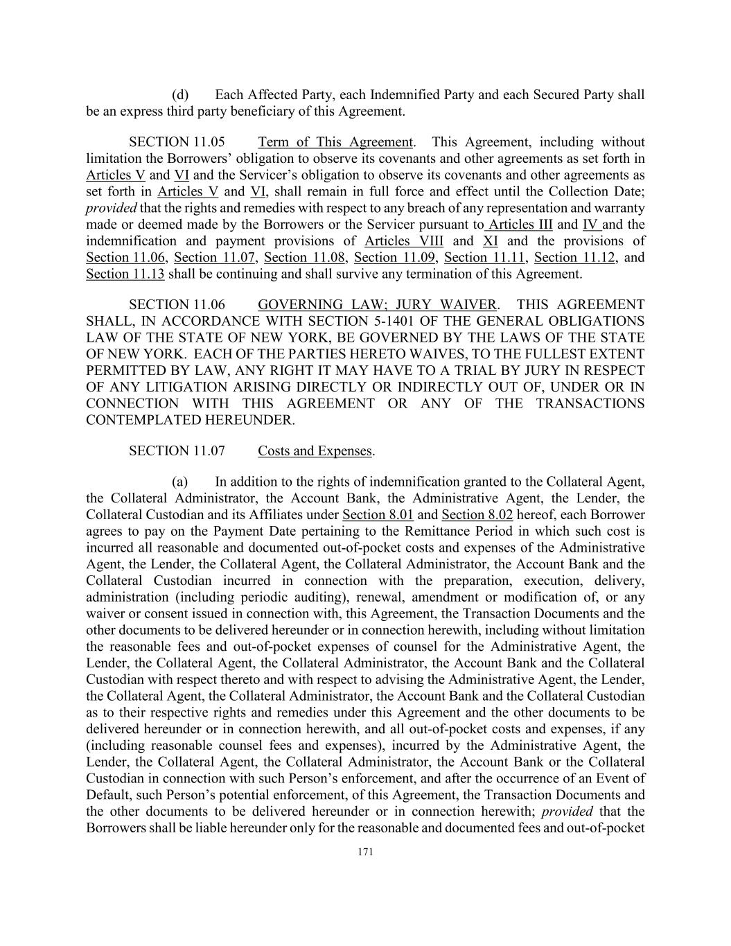 171 (d) Each Affected Party, each Indemnified Party and each Secured Party shall be an express third party beneficiary of this Agreement. SECTION 11.05 Term of This Agreement. This Agreement, including without limitation the Borrowers’ obligation to observe its covenants and other agreements as set forth in Articles V and VI and the Servicer’s obligation to observe its covenants and other agreements as set forth in Articles V and VI, shall remain in full force and effect until the Collection Date; provided that the rights and remedies with respect to any breach of any representation and warranty made or deemed made by the Borrowers or the Servicer pursuant to Articles III and IV and the indemnification and payment provisions of Articles VIII and XI and the provisions of Section 11.06, Section 11.07, Section 11.08, Section 11.09, Section 11.11, Section 11.12, and Section 11.13 shall be continuing and shall survive any termination of this Agreement. SECTION 11.06 GOVERNING LAW; JURY WAIVER. THIS AGREEMENT SHALL, IN ACCORDANCE WITH SECTION 5-1401 OF THE GENERAL OBLIGATIONS LAW OF THE STATE OF NEW YORK, BE GOVERNED BY THE LAWS OF THE STATE OF NEW YORK. EACH OF THE PARTIES HERETO WAIVES, TO THE FULLEST EXTENT PERMITTED BY LAW, ANY RIGHT IT MAY HAVE TO A TRIAL BY JURY IN RESPECT OF ANY LITIGATION ARISING DIRECTLY OR INDIRECTLY OUT OF, UNDER OR IN CONNECTION WITH THIS AGREEMENT OR ANY OF THE TRANSACTIONS CONTEMPLATED HEREUNDER. SECTION 11.07 Costs and Expenses. (a) In addition to the rights of indemnification granted to the Collateral Agent, the Collateral Administrator, the Account Bank, the Administrative Agent, the Lender, the Collateral Custodian and its Affiliates under Section 8.01 and Section 8.02 hereof, each Borrower agrees to pay on the Payment Date pertaining to the Remittance Period in which such cost is incurred all reasonable and documented out-of-pocket costs and expenses of the Administrative Agent, the Lender, the Collateral Agent, the Collateral Administrator, the Account Bank and the Collateral Custodian incurred in connection with the preparation, execution, delivery, administration (including periodic auditing), renewal, amendment or modification of, or any waiver or consent issued in connection with, this Agreement, the Transaction Documents and the other documents to be delivered hereunder or in connection herewith, including without limitation the reasonable fees and out-of-pocket expenses of counsel for the Administrative Agent, the Lender, the Collateral Agent, the Collateral Administrator, the Account Bank and the Collateral Custodian with respect thereto and with respect to advising the Administrative Agent, the Lender, the Collateral Agent, the Collateral Administrator, the Account Bank and the Collateral Custodian as to their respective rights and remedies under this Agreement and the other documents to be delivered hereunder or in connection herewith, and all out-of-pocket costs and expenses, if any (including reasonable counsel fees and expenses), incurred by the Administrative Agent, the Lender, the Collateral Agent, the Collateral Administrator, the Account Bank or the Collateral Custodian in connection with such Person’s enforcement, and after the occurrence of an Event of Default, such Person’s potential enforcement, of this Agreement, the Transaction Documents and the other documents to be delivered hereunder or in connection herewith; provided that the Borrowers shall be liable hereunder only for the reasonable and documented fees and out-of-pocket