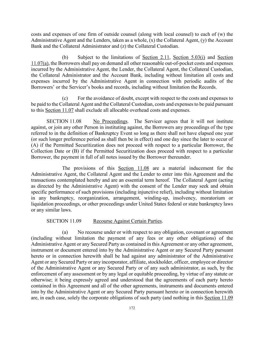 172 costs and expenses of one firm of outside counsel (along with local counsel) to each of (w) the Administrative Agent and the Lenders, taken as a whole, (x) the Collateral Agent, (y) the Account Bank and the Collateral Administrator and (z) the Collateral Custodian. (b) Subject to the limitations of Section 2.11, Section 5.03(i) and Section 11.07(a), the Borrowers shall pay on demand all other reasonable out-of-pocket costs and expenses incurred by the Administrative Agent, the Lender, the Collateral Agent, the Collateral Custodian, the Collateral Administrator and the Account Bank, including without limitation all costs and expenses incurred by the Administrative Agent in connection with periodic audits of the Borrowers’ or the Servicer’s books and records, including without limitation the Records. (c) For the avoidance of doubt, except with respect to the costs and expenses to be paid to the Collateral Agent and the Collateral Custodian, costs and expenses to be paid pursuant to this Section 11.07 shall exclude all allocable overhead costs and expenses. SECTION 11.08 No Proceedings. The Servicer agrees that it will not institute against, or join any other Person in instituting against, the Borrowers any proceedings of the type referred to in the definition of Bankruptcy Event so long as there shall not have elapsed one year (or such longer preference period as shall then be in effect) and one day since the later to occur of (A) if the Permitted Securitization does not proceed with respect to a particular Borrower, the Collection Date or (B) if the Permitted Securitization does proceed with respect to a particular Borrower, the payment in full of all notes issued by the Borrower thereunder. The provisions of this Section 11.08 are a material inducement for the Administrative Agent, the Collateral Agent and the Lender to enter into this Agreement and the transactions contemplated hereby and are an essential term hereof. The Collateral Agent (acting as directed by the Administrative Agent) with the consent of the Lender may seek and obtain specific performance of such provisions (including injunctive relief), including without limitation in any bankruptcy, reorganization, arrangement, winding-up, insolvency, moratorium or liquidation proceedings, or other proceedings under United States federal or state bankruptcy laws or any similar laws. SECTION 11.09 Recourse Against Certain Parties. (a) No recourse under or with respect to any obligation, covenant or agreement (including without limitation the payment of any fees or any other obligations) of the Administrative Agent or any Secured Party as contained in this Agreement or any other agreement, instrument or document entered into by the Administrative Agent or any Secured Party pursuant hereto or in connection herewith shall be had against any administrator of the Administrative Agent or any Secured Party or any incorporator, affiliate, stockholder, officer, employee or director of the Administrative Agent or any Secured Party or of any such administrator, as such, by the enforcement of any assessment or by any legal or equitable proceeding, by virtue of any statute or otherwise; it being expressly agreed and understood that the agreements of each party hereto contained in this Agreement and all of the other agreements, instruments and documents entered into by the Administrative Agent or any Secured Party pursuant hereto or in connection herewith are, in each case, solely the corporate obligations of such party (and nothing in this Section 11.09