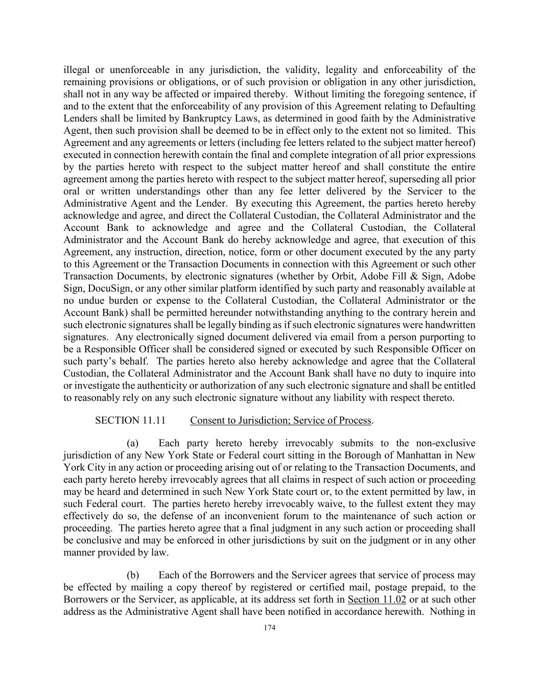 174 illegal or unenforceable in any jurisdiction, the validity, legality and enforceability of the remaining provisions or obligations, or of such provision or obligation in any other jurisdiction, shall not in any way be affected or impaired thereby. Without limiting the foregoing sentence, if and to the extent that the enforceability of any provision of this Agreement relating to Defaulting Lenders shall be limited by Bankruptcy Laws, as determined in good faith by the Administrative Agent, then such provision shall be deemed to be in effect only to the extent not so limited. This Agreement and any agreements or letters (including fee letters related to the subject matter hereof) executed in connection herewith contain the final and complete integration of all prior expressions by the parties hereto with respect to the subject matter hereof and shall constitute the entire agreement among the parties hereto with respect to the subject matter hereof, superseding all prior oral or written understandings other than any fee letter delivered by the Servicer to the Administrative Agent and the Lender. By executing this Agreement, the parties hereto hereby acknowledge and agree, and direct the Collateral Custodian, the Collateral Administrator and the Account Bank to acknowledge and agree and the Collateral Custodian, the Collateral Administrator and the Account Bank do hereby acknowledge and agree, that execution of this Agreement, any instruction, direction, notice, form or other document executed by the any party to this Agreement or the Transaction Documents in connection with this Agreement or such other Transaction Documents, by electronic signatures (whether by Orbit, Adobe Fill & Sign, Adobe Sign, DocuSign, or any other similar platform identified by such party and reasonably available at no undue burden or expense to the Collateral Custodian, the Collateral Administrator or the Account Bank) shall be permitted hereunder notwithstanding anything to the contrary herein and such electronic signatures shall be legally binding as if such electronic signatures were handwritten signatures. Any electronically signed document delivered via email from a person purporting to be a Responsible Officer shall be considered signed or executed by such Responsible Officer on such party’s behalf. The parties hereto also hereby acknowledge and agree that the Collateral Custodian, the Collateral Administrator and the Account Bank shall have no duty to inquire into or investigate the authenticity or authorization of any such electronic signature and shall be entitled to reasonably rely on any such electronic signature without any liability with respect thereto. SECTION 11.11 Consent to Jurisdiction; Service of Process. (a) Each party hereto hereby irrevocably submits to the non-exclusive jurisdiction of any New York State or Federal court sitting in the Borough of Manhattan in New York City in any action or proceeding arising out of or relating to the Transaction Documents, and each party hereto hereby irrevocably agrees that all claims in respect of such action or proceeding may be heard and determined in such New York State court or, to the extent permitted by law, in such Federal court. The parties hereto hereby irrevocably waive, to the fullest extent they may effectively do so, the defense of an inconvenient forum to the maintenance of such action or proceeding. The parties hereto agree that a final judgment in any such action or proceeding shall be conclusive and may be enforced in other jurisdictions by suit on the judgment or in any other manner provided by law. (b) Each of the Borrowers and the Servicer agrees that service of process may be effected by mailing a copy thereof by registered or certified mail, postage prepaid, to the Borrowers or the Servicer, as applicable, at its address set forth in Section 11.02 or at such other address as the Administrative Agent shall have been notified in accordance herewith. Nothing in