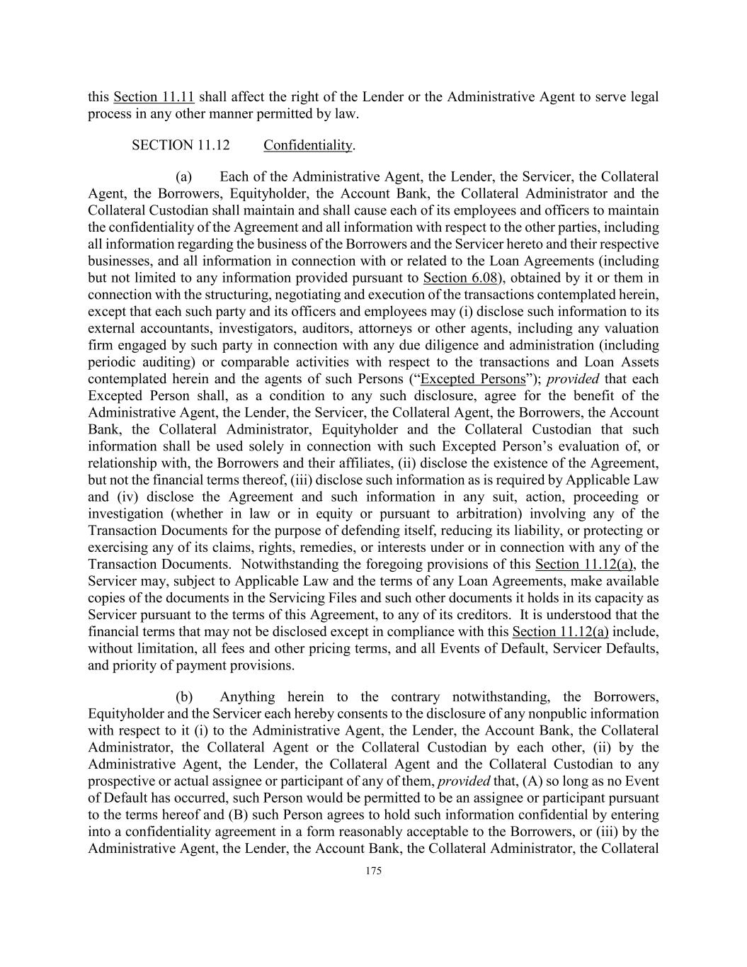 175 this Section 11.11 shall affect the right of the Lender or the Administrative Agent to serve legal process in any other manner permitted by law. SECTION 11.12 Confidentiality. (a) Each of the Administrative Agent, the Lender, the Servicer, the Collateral Agent, the Borrowers, Equityholder, the Account Bank, the Collateral Administrator and the Collateral Custodian shall maintain and shall cause each of its employees and officers to maintain the confidentiality of the Agreement and all information with respect to the other parties, including all information regarding the business of the Borrowers and the Servicer hereto and their respective businesses, and all information in connection with or related to the Loan Agreements (including but not limited to any information provided pursuant to Section 6.08), obtained by it or them in connection with the structuring, negotiating and execution of the transactions contemplated herein, except that each such party and its officers and employees may (i) disclose such information to its external accountants, investigators, auditors, attorneys or other agents, including any valuation firm engaged by such party in connection with any due diligence and administration (including periodic auditing) or comparable activities with respect to the transactions and Loan Assets contemplated herein and the agents of such Persons (“Excepted Persons”); provided that each Excepted Person shall, as a condition to any such disclosure, agree for the benefit of the Administrative Agent, the Lender, the Servicer, the Collateral Agent, the Borrowers, the Account Bank, the Collateral Administrator, Equityholder and the Collateral Custodian that such information shall be used solely in connection with such Excepted Person’s evaluation of, or relationship with, the Borrowers and their affiliates, (ii) disclose the existence of the Agreement, but not the financial terms thereof, (iii) disclose such information as is required by Applicable Law and (iv) disclose the Agreement and such information in any suit, action, proceeding or investigation (whether in law or in equity or pursuant to arbitration) involving any of the Transaction Documents for the purpose of defending itself, reducing its liability, or protecting or exercising any of its claims, rights, remedies, or interests under or in connection with any of the Transaction Documents. Notwithstanding the foregoing provisions of this Section 11.12(a), the Servicer may, subject to Applicable Law and the terms of any Loan Agreements, make available copies of the documents in the Servicing Files and such other documents it holds in its capacity as Servicer pursuant to the terms of this Agreement, to any of its creditors. It is understood that the financial terms that may not be disclosed except in compliance with this Section 11.12(a) include, without limitation, all fees and other pricing terms, and all Events of Default, Servicer Defaults, and priority of payment provisions. (b) Anything herein to the contrary notwithstanding, the Borrowers, Equityholder and the Servicer each hereby consents to the disclosure of any nonpublic information with respect to it (i) to the Administrative Agent, the Lender, the Account Bank, the Collateral Administrator, the Collateral Agent or the Collateral Custodian by each other, (ii) by the Administrative Agent, the Lender, the Collateral Agent and the Collateral Custodian to any prospective or actual assignee or participant of any of them, provided that, (A) so long as no Event of Default has occurred, such Person would be permitted to be an assignee or participant pursuant to the terms hereof and (B) such Person agrees to hold such information confidential by entering into a confidentiality agreement in a form reasonably acceptable to the Borrowers, or (iii) by the Administrative Agent, the Lender, the Account Bank, the Collateral Administrator, the Collateral