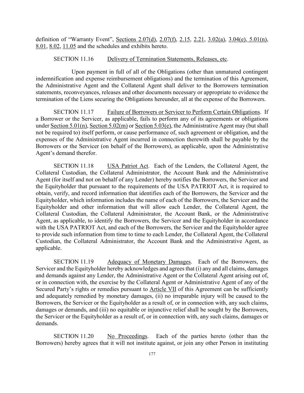 177 definition of “Warranty Event”, Sections 2.07(d), 2.07(f), 2.15, 2.21, 3.02(a), 3.04(e), 5.01(n), 8.01, 8.02, 11.05 and the schedules and exhibits hereto. SECTION 11.16 Delivery of Termination Statements, Releases, etc. Upon payment in full of all of the Obligations (other than unmatured contingent indemnification and expense reimbursement obligations) and the termination of this Agreement, the Administrative Agent and the Collateral Agent shall deliver to the Borrowers termination statements, reconveyances, releases and other documents necessary or appropriate to evidence the termination of the Liens securing the Obligations hereunder, all at the expense of the Borrowers. SECTION 11.17 Failure of Borrowers or Servicer to Perform Certain Obligations. If a Borrower or the Servicer, as applicable, fails to perform any of its agreements or obligations under Section 5.01(n), Section 5.02(m) or Section 5.03(e), the Administrative Agent may (but shall not be required to) itself perform, or cause performance of, such agreement or obligation, and the expenses of the Administrative Agent incurred in connection therewith shall be payable by the Borrowers or the Servicer (on behalf of the Borrowers), as applicable, upon the Administrative Agent’s demand therefor. SECTION 11.18 USA Patriot Act. Each of the Lenders, the Collateral Agent, the Collateral Custodian, the Collateral Administrator, the Account Bank and the Administrative Agent (for itself and not on behalf of any Lender) hereby notifies the Borrowers, the Servicer and the Equityholder that pursuant to the requirements of the USA PATRIOT Act, it is required to obtain, verify, and record information that identifies each of the Borrowers, the Servicer and the Equityholder, which information includes the name of each of the Borrowers, the Servicer and the Equityholder and other information that will allow each Lender, the Collateral Agent, the Collateral Custodian, the Collateral Administrator, the Account Bank, or the Administrative Agent, as applicable, to identify the Borrowers, the Servicer and the Equityholder in accordance with the USA PATRIOT Act, and each of the Borrowers, the Servicer and the Equityholder agree to provide such information from time to time to each Lender, the Collateral Agent, the Collateral Custodian, the Collateral Administrator, the Account Bank and the Administrative Agent, as applicable. SECTION 11.19 Adequacy of Monetary Damages. Each of the Borrowers, the Servicer and the Equityholder hereby acknowledges and agrees that (i) any and all claims, damages and demands against any Lender, the Administrative Agent or the Collateral Agent arising out of, or in connection with, the exercise by the Collateral Agent or Administrative Agent of any of the Secured Party’s rights or remedies pursuant to Article VII of this Agreement can be sufficiently and adequately remedied by monetary damages, (ii) no irreparable injury will be caused to the Borrowers, the Servicer or the Equityholder as a result of, or in connection with, any such claims, damages or demands, and (iii) no equitable or injunctive relief shall be sought by the Borrowers, the Servicer or the Equityholder as a result of, or in connection with, any such claims, damages or demands. SECTION 11.20 No Proceedings. Each of the parties hereto (other than the Borrowers) hereby agrees that it will not institute against, or join any other Person in instituting