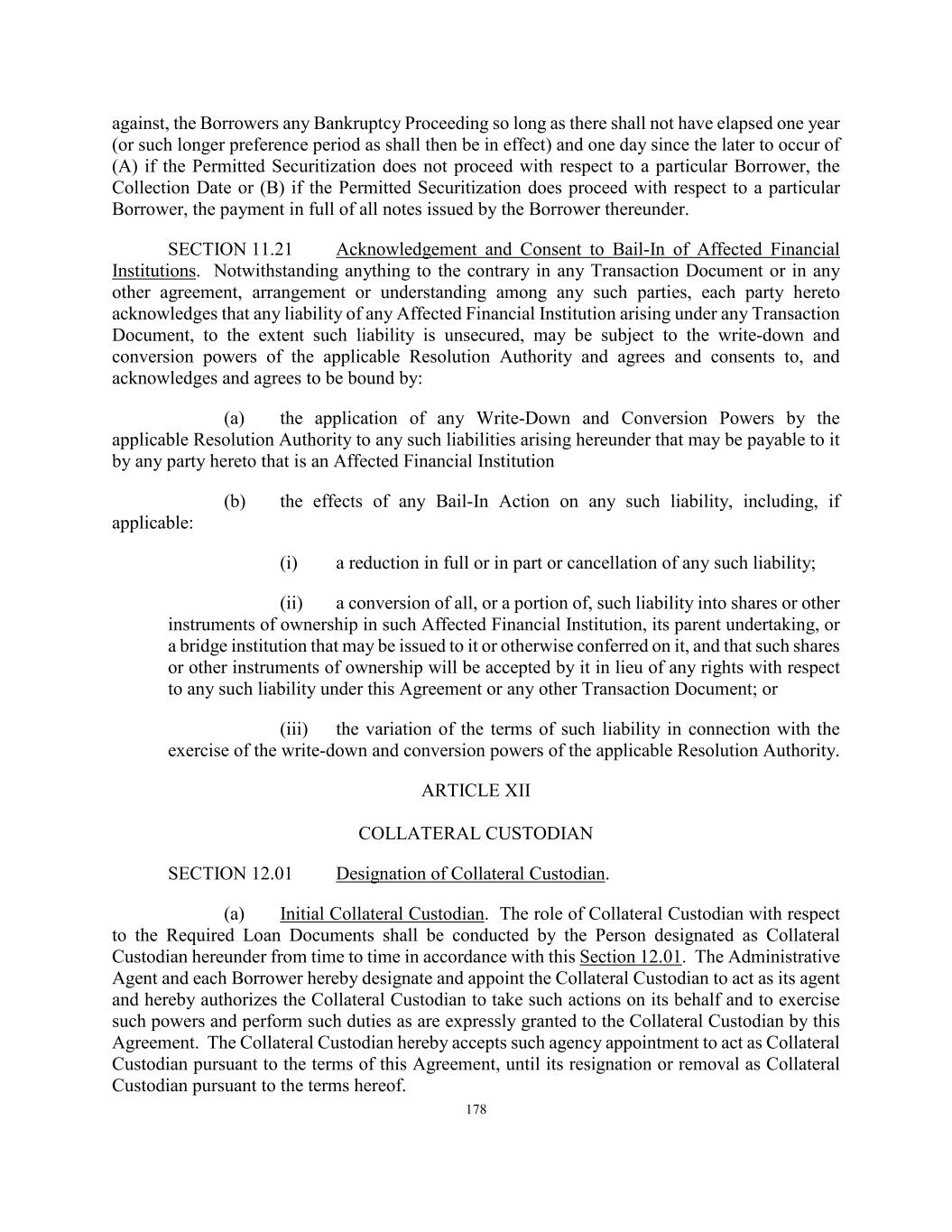 178 against, the Borrowers any Bankruptcy Proceeding so long as there shall not have elapsed one year (or such longer preference period as shall then be in effect) and one day since the later to occur of (A) if the Permitted Securitization does not proceed with respect to a particular Borrower, the Collection Date or (B) if the Permitted Securitization does proceed with respect to a particular Borrower, the payment in full of all notes issued by the Borrower thereunder. SECTION 11.21 Acknowledgement and Consent to Bail-In of Affected Financial Institutions. Notwithstanding anything to the contrary in any Transaction Document or in any other agreement, arrangement or understanding among any such parties, each party hereto acknowledges that any liability of any Affected Financial Institution arising under any Transaction Document, to the extent such liability is unsecured, may be subject to the write-down and conversion powers of the applicable Resolution Authority and agrees and consents to, and acknowledges and agrees to be bound by: (a) the application of any Write-Down and Conversion Powers by the applicable Resolution Authority to any such liabilities arising hereunder that may be payable to it by any party hereto that is an Affected Financial Institution (b) the effects of any Bail-In Action on any such liability, including, if applicable: (i) a reduction in full or in part or cancellation of any such liability; (ii) a conversion of all, or a portion of, such liability into shares or other instruments of ownership in such Affected Financial Institution, its parent undertaking, or a bridge institution that may be issued to it or otherwise conferred on it, and that such shares or other instruments of ownership will be accepted by it in lieu of any rights with respect to any such liability under this Agreement or any other Transaction Document; or (iii) the variation of the terms of such liability in connection with the exercise of the write-down and conversion powers of the applicable Resolution Authority. ARTICLE XII COLLATERAL CUSTODIAN SECTION 12.01 Designation of Collateral Custodian. (a) Initial Collateral Custodian. The role of Collateral Custodian with respect to the Required Loan Documents shall be conducted by the Person designated as Collateral Custodian hereunder from time to time in accordance with this Section 12.01. The Administrative Agent and each Borrower hereby designate and appoint the Collateral Custodian to act as its agent and hereby authorizes the Collateral Custodian to take such actions on its behalf and to exercise such powers and perform such duties as are expressly granted to the Collateral Custodian by this Agreement. The Collateral Custodian hereby accepts such agency appointment to act as Collateral Custodian pursuant to the terms of this Agreement, until its resignation or removal as Collateral Custodian pursuant to the terms hereof.