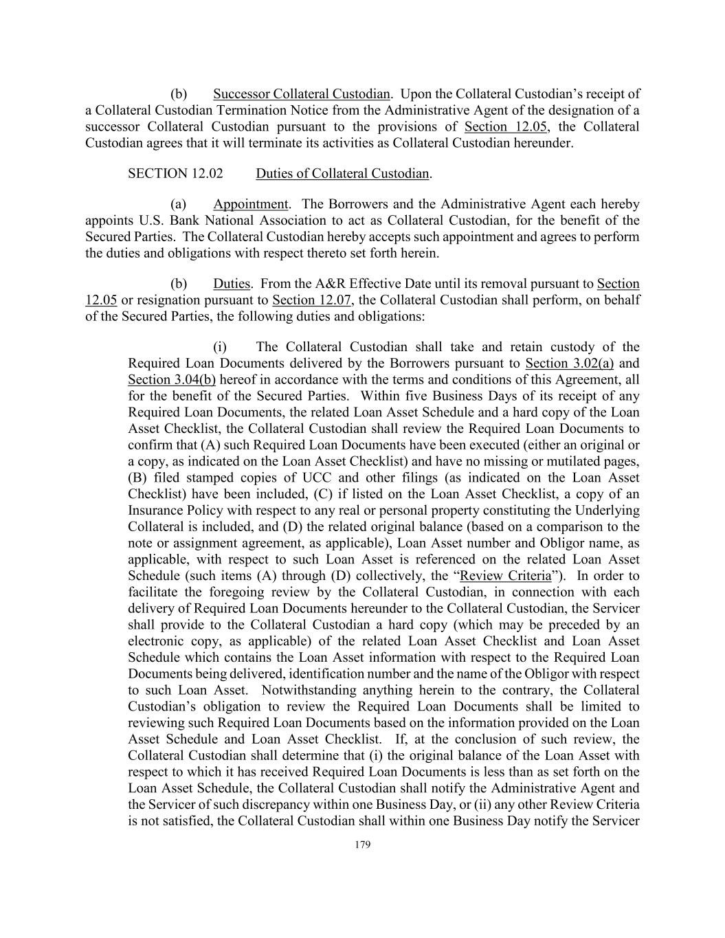 179 (b) Successor Collateral Custodian. Upon the Collateral Custodian’s receipt of a Collateral Custodian Termination Notice from the Administrative Agent of the designation of a successor Collateral Custodian pursuant to the provisions of Section 12.05, the Collateral Custodian agrees that it will terminate its activities as Collateral Custodian hereunder. SECTION 12.02 Duties of Collateral Custodian. (a) Appointment. The Borrowers and the Administrative Agent each hereby appoints U.S. Bank National Association to act as Collateral Custodian, for the benefit of the Secured Parties. The Collateral Custodian hereby accepts such appointment and agrees to perform the duties and obligations with respect thereto set forth herein. (b) Duties. From the A&R Effective Date until its removal pursuant to Section 12.05 or resignation pursuant to Section 12.07, the Collateral Custodian shall perform, on behalf of the Secured Parties, the following duties and obligations: (i) The Collateral Custodian shall take and retain custody of the Required Loan Documents delivered by the Borrowers pursuant to Section 3.02(a) and Section 3.04(b) hereof in accordance with the terms and conditions of this Agreement, all for the benefit of the Secured Parties. Within five Business Days of its receipt of any Required Loan Documents, the related Loan Asset Schedule and a hard copy of the Loan Asset Checklist, the Collateral Custodian shall review the Required Loan Documents to confirm that (A) such Required Loan Documents have been executed (either an original or a copy, as indicated on the Loan Asset Checklist) and have no missing or mutilated pages, (B) filed stamped copies of UCC and other filings (as indicated on the Loan Asset Checklist) have been included, (C) if listed on the Loan Asset Checklist, a copy of an Insurance Policy with respect to any real or personal property constituting the Underlying Collateral is included, and (D) the related original balance (based on a comparison to the note or assignment agreement, as applicable), Loan Asset number and Obligor name, as applicable, with respect to such Loan Asset is referenced on the related Loan Asset Schedule (such items (A) through (D) collectively, the “Review Criteria”). In order to facilitate the foregoing review by the Collateral Custodian, in connection with each delivery of Required Loan Documents hereunder to the Collateral Custodian, the Servicer shall provide to the Collateral Custodian a hard copy (which may be preceded by an electronic copy, as applicable) of the related Loan Asset Checklist and Loan Asset Schedule which contains the Loan Asset information with respect to the Required Loan Documents being delivered, identification number and the name of the Obligor with respect to such Loan Asset. Notwithstanding anything herein to the contrary, the Collateral Custodian’s obligation to review the Required Loan Documents shall be limited to reviewing such Required Loan Documents based on the information provided on the Loan Asset Schedule and Loan Asset Checklist. If, at the conclusion of such review, the Collateral Custodian shall determine that (i) the original balance of the Loan Asset with respect to which it has received Required Loan Documents is less than as set forth on the Loan Asset Schedule, the Collateral Custodian shall notify the Administrative Agent and the Servicer of such discrepancy within one Business Day, or (ii) any other Review Criteria is not satisfied, the Collateral Custodian shall within one Business Day notify the Servicer