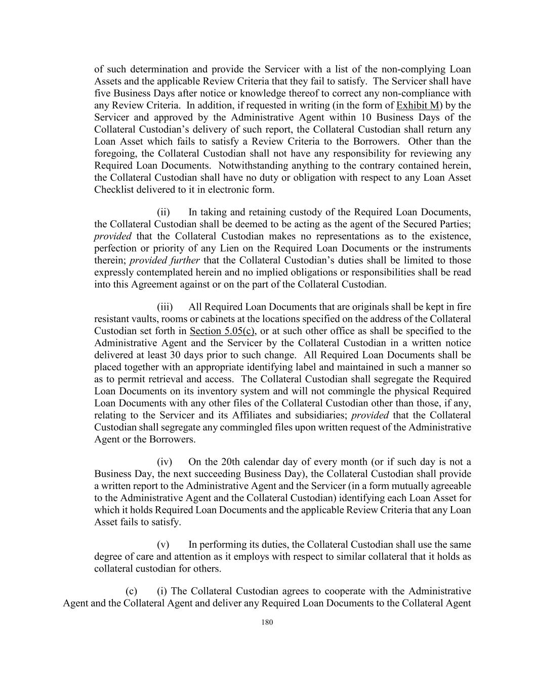 180 of such determination and provide the Servicer with a list of the non-complying Loan Assets and the applicable Review Criteria that they fail to satisfy. The Servicer shall have five Business Days after notice or knowledge thereof to correct any non-compliance with any Review Criteria. In addition, if requested in writing (in the form of Exhibit M) by the Servicer and approved by the Administrative Agent within 10 Business Days of the Collateral Custodian’s delivery of such report, the Collateral Custodian shall return any Loan Asset which fails to satisfy a Review Criteria to the Borrowers. Other than the foregoing, the Collateral Custodian shall not have any responsibility for reviewing any Required Loan Documents. Notwithstanding anything to the contrary contained herein, the Collateral Custodian shall have no duty or obligation with respect to any Loan Asset Checklist delivered to it in electronic form. (ii) In taking and retaining custody of the Required Loan Documents, the Collateral Custodian shall be deemed to be acting as the agent of the Secured Parties; provided that the Collateral Custodian makes no representations as to the existence, perfection or priority of any Lien on the Required Loan Documents or the instruments therein; provided further that the Collateral Custodian’s duties shall be limited to those expressly contemplated herein and no implied obligations or responsibilities shall be read into this Agreement against or on the part of the Collateral Custodian. (iii) All Required Loan Documents that are originals shall be kept in fire resistant vaults, rooms or cabinets at the locations specified on the address of the Collateral Custodian set forth in Section 5.05(c), or at such other office as shall be specified to the Administrative Agent and the Servicer by the Collateral Custodian in a written notice delivered at least 30 days prior to such change. All Required Loan Documents shall be placed together with an appropriate identifying label and maintained in such a manner so as to permit retrieval and access. The Collateral Custodian shall segregate the Required Loan Documents on its inventory system and will not commingle the physical Required Loan Documents with any other files of the Collateral Custodian other than those, if any, relating to the Servicer and its Affiliates and subsidiaries; provided that the Collateral Custodian shall segregate any commingled files upon written request of the Administrative Agent or the Borrowers. (iv) On the 20th calendar day of every month (or if such day is not a Business Day, the next succeeding Business Day), the Collateral Custodian shall provide a written report to the Administrative Agent and the Servicer (in a form mutually agreeable to the Administrative Agent and the Collateral Custodian) identifying each Loan Asset for which it holds Required Loan Documents and the applicable Review Criteria that any Loan Asset fails to satisfy. (v) In performing its duties, the Collateral Custodian shall use the same degree of care and attention as it employs with respect to similar collateral that it holds as collateral custodian for others. (c) (i) The Collateral Custodian agrees to cooperate with the Administrative Agent and the Collateral Agent and deliver any Required Loan Documents to the Collateral Agent