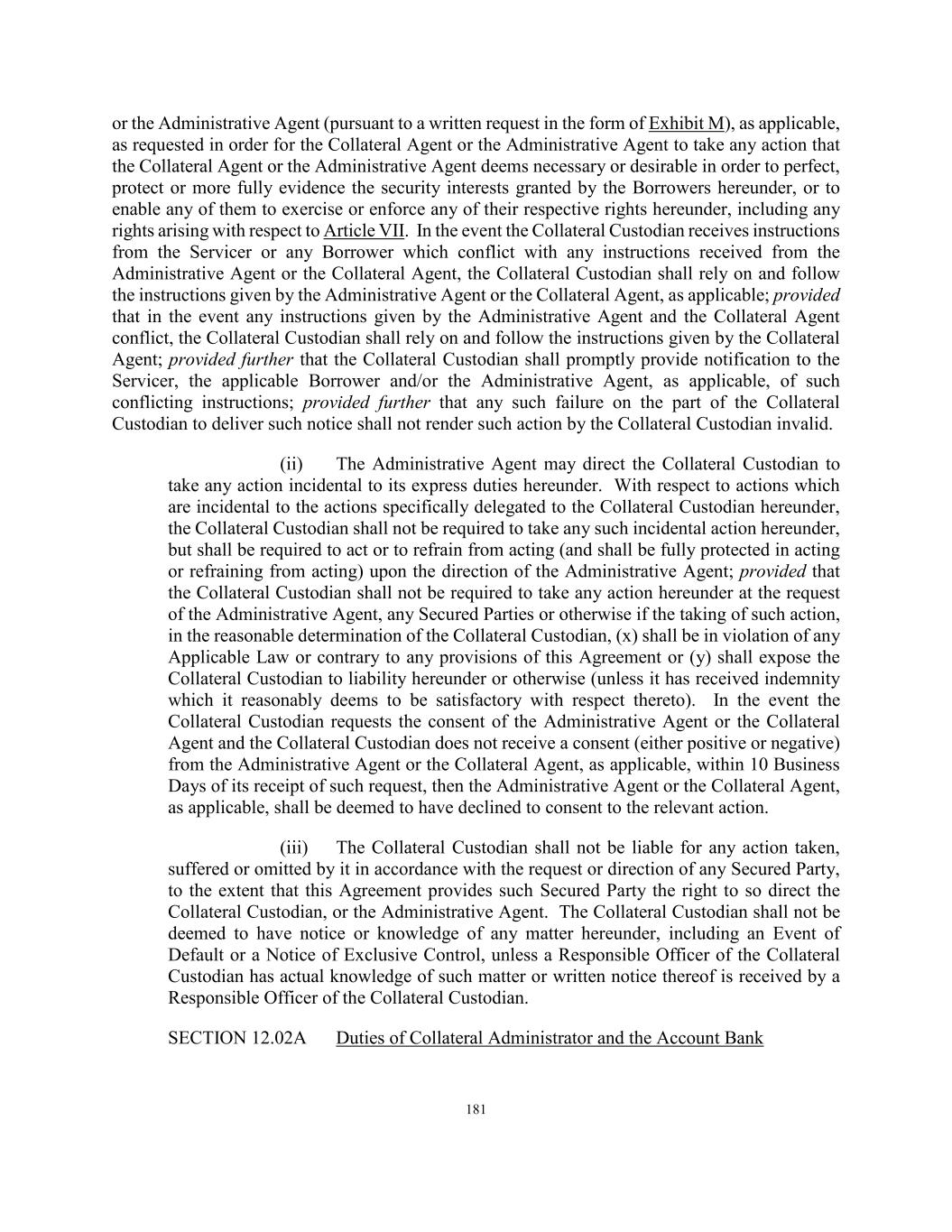181 or the Administrative Agent (pursuant to a written request in the form of Exhibit M), as applicable, as requested in order for the Collateral Agent or the Administrative Agent to take any action that the Collateral Agent or the Administrative Agent deems necessary or desirable in order to perfect, protect or more fully evidence the security interests granted by the Borrowers hereunder, or to enable any of them to exercise or enforce any of their respective rights hereunder, including any rights arising with respect to Article VII. In the event the Collateral Custodian receives instructions from the Servicer or any Borrower which conflict with any instructions received from the Administrative Agent or the Collateral Agent, the Collateral Custodian shall rely on and follow the instructions given by the Administrative Agent or the Collateral Agent, as applicable; provided that in the event any instructions given by the Administrative Agent and the Collateral Agent conflict, the Collateral Custodian shall rely on and follow the instructions given by the Collateral Agent; provided further that the Collateral Custodian shall promptly provide notification to the Servicer, the applicable Borrower and/or the Administrative Agent, as applicable, of such conflicting instructions; provided further that any such failure on the part of the Collateral Custodian to deliver such notice shall not render such action by the Collateral Custodian invalid. (ii) The Administrative Agent may direct the Collateral Custodian to take any action incidental to its express duties hereunder. With respect to actions which are incidental to the actions specifically delegated to the Collateral Custodian hereunder, the Collateral Custodian shall not be required to take any such incidental action hereunder, but shall be required to act or to refrain from acting (and shall be fully protected in acting or refraining from acting) upon the direction of the Administrative Agent; provided that the Collateral Custodian shall not be required to take any action hereunder at the request of the Administrative Agent, any Secured Parties or otherwise if the taking of such action, in the reasonable determination of the Collateral Custodian, (x) shall be in violation of any Applicable Law or contrary to any provisions of this Agreement or (y) shall expose the Collateral Custodian to liability hereunder or otherwise (unless it has received indemnity which it reasonably deems to be satisfactory with respect thereto). In the event the Collateral Custodian requests the consent of the Administrative Agent or the Collateral Agent and the Collateral Custodian does not receive a consent (either positive or negative) from the Administrative Agent or the Collateral Agent, as applicable, within 10 Business Days of its receipt of such request, then the Administrative Agent or the Collateral Agent, as applicable, shall be deemed to have declined to consent to the relevant action. (iii) The Collateral Custodian shall not be liable for any action taken, suffered or omitted by it in accordance with the request or direction of any Secured Party, to the extent that this Agreement provides such Secured Party the right to so direct the Collateral Custodian, or the Administrative Agent. The Collateral Custodian shall not be deemed to have notice or knowledge of any matter hereunder, including an Event of Default or a Notice of Exclusive Control, unless a Responsible Officer of the Collateral Custodian has actual knowledge of such matter or written notice thereof is received by a Responsible Officer of the Collateral Custodian. SECTION 12.02A Duties of Collateral Administrator and the Account Bank