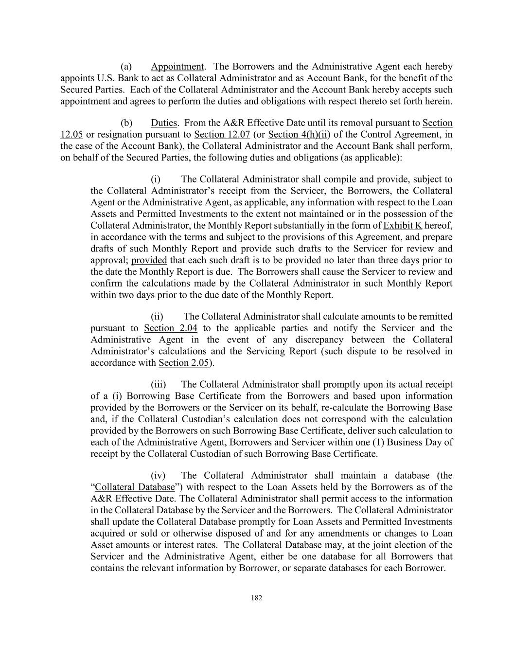 182 (a) Appointment. The Borrowers and the Administrative Agent each hereby appoints U.S. Bank to act as Collateral Administrator and as Account Bank, for the benefit of the Secured Parties. Each of the Collateral Administrator and the Account Bank hereby accepts such appointment and agrees to perform the duties and obligations with respect thereto set forth herein. (b) Duties. From the A&R Effective Date until its removal pursuant to Section 12.05 or resignation pursuant to Section 12.07 (or Section 4(h)(ii) of the Control Agreement, in the case of the Account Bank), the Collateral Administrator and the Account Bank shall perform, on behalf of the Secured Parties, the following duties and obligations (as applicable): (i) The Collateral Administrator shall compile and provide, subject to the Collateral Administrator’s receipt from the Servicer, the Borrowers, the Collateral Agent or the Administrative Agent, as applicable, any information with respect to the Loan Assets and Permitted Investments to the extent not maintained or in the possession of the Collateral Administrator, the Monthly Report substantially in the form of Exhibit K hereof, in accordance with the terms and subject to the provisions of this Agreement, and prepare drafts of such Monthly Report and provide such drafts to the Servicer for review and approval; provided that each such draft is to be provided no later than three days prior to the date the Monthly Report is due. The Borrowers shall cause the Servicer to review and confirm the calculations made by the Collateral Administrator in such Monthly Report within two days prior to the due date of the Monthly Report. (ii) The Collateral Administrator shall calculate amounts to be remitted pursuant to Section 2.04 to the applicable parties and notify the Servicer and the Administrative Agent in the event of any discrepancy between the Collateral Administrator’s calculations and the Servicing Report (such dispute to be resolved in accordance with Section 2.05). (iii) The Collateral Administrator shall promptly upon its actual receipt of a (i) Borrowing Base Certificate from the Borrowers and based upon information provided by the Borrowers or the Servicer on its behalf, re-calculate the Borrowing Base and, if the Collateral Custodian’s calculation does not correspond with the calculation provided by the Borrowers on such Borrowing Base Certificate, deliver such calculation to each of the Administrative Agent, Borrowers and Servicer within one (1) Business Day of receipt by the Collateral Custodian of such Borrowing Base Certificate. (iv) The Collateral Administrator shall maintain a database (the “Collateral Database”) with respect to the Loan Assets held by the Borrowers as of the A&R Effective Date. The Collateral Administrator shall permit access to the information in the Collateral Database by the Servicer and the Borrowers. The Collateral Administrator shall update the Collateral Database promptly for Loan Assets and Permitted Investments acquired or sold or otherwise disposed of and for any amendments or changes to Loan Asset amounts or interest rates. The Collateral Database may, at the joint election of the Servicer and the Administrative Agent, either be one database for all Borrowers that contains the relevant information by Borrower, or separate databases for each Borrower.