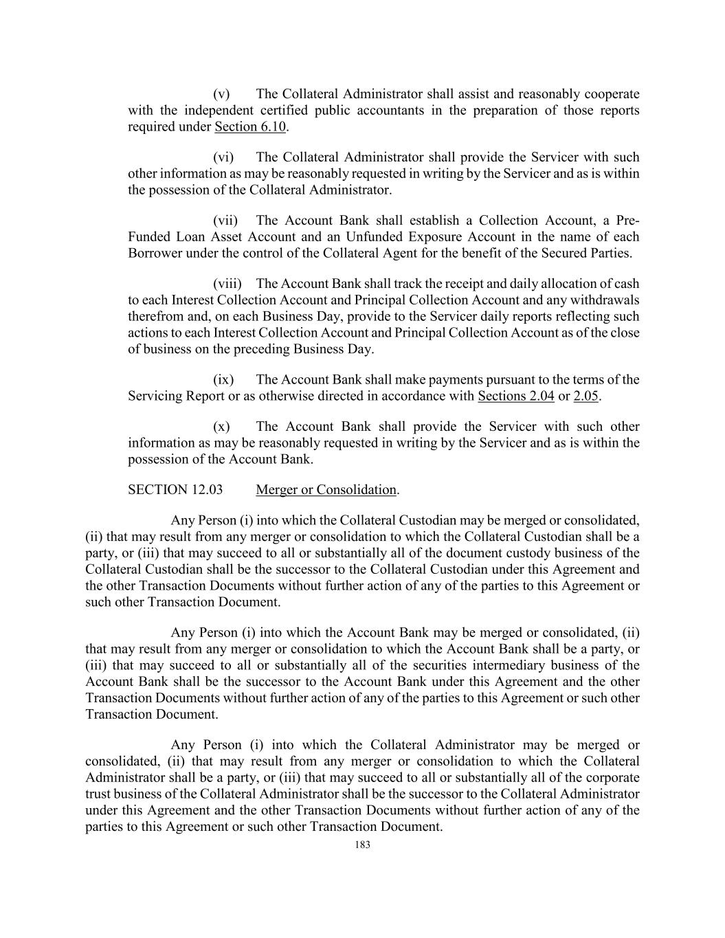 183 (v) The Collateral Administrator shall assist and reasonably cooperate with the independent certified public accountants in the preparation of those reports required under Section 6.10. (vi) The Collateral Administrator shall provide the Servicer with such other information as may be reasonably requested in writing by the Servicer and as is within the possession of the Collateral Administrator. (vii) The Account Bank shall establish a Collection Account, a Pre- Funded Loan Asset Account and an Unfunded Exposure Account in the name of each Borrower under the control of the Collateral Agent for the benefit of the Secured Parties. (viii) The Account Bank shall track the receipt and daily allocation of cash to each Interest Collection Account and Principal Collection Account and any withdrawals therefrom and, on each Business Day, provide to the Servicer daily reports reflecting such actions to each Interest Collection Account and Principal Collection Account as of the close of business on the preceding Business Day. (ix) The Account Bank shall make payments pursuant to the terms of the Servicing Report or as otherwise directed in accordance with Sections 2.04 or 2.05. (x) The Account Bank shall provide the Servicer with such other information as may be reasonably requested in writing by the Servicer and as is within the possession of the Account Bank. SECTION 12.03 Merger or Consolidation. Any Person (i) into which the Collateral Custodian may be merged or consolidated, (ii) that may result from any merger or consolidation to which the Collateral Custodian shall be a party, or (iii) that may succeed to all or substantially all of the document custody business of the Collateral Custodian shall be the successor to the Collateral Custodian under this Agreement and the other Transaction Documents without further action of any of the parties to this Agreement or such other Transaction Document. Any Person (i) into which the Account Bank may be merged or consolidated, (ii) that may result from any merger or consolidation to which the Account Bank shall be a party, or (iii) that may succeed to all or substantially all of the securities intermediary business of the Account Bank shall be the successor to the Account Bank under this Agreement and the other Transaction Documents without further action of any of the parties to this Agreement or such other Transaction Document. Any Person (i) into which the Collateral Administrator may be merged or consolidated, (ii) that may result from any merger or consolidation to which the Collateral Administrator shall be a party, or (iii) that may succeed to all or substantially all of the corporate trust business of the Collateral Administrator shall be the successor to the Collateral Administrator under this Agreement and the other Transaction Documents without further action of any of the parties to this Agreement or such other Transaction Document.