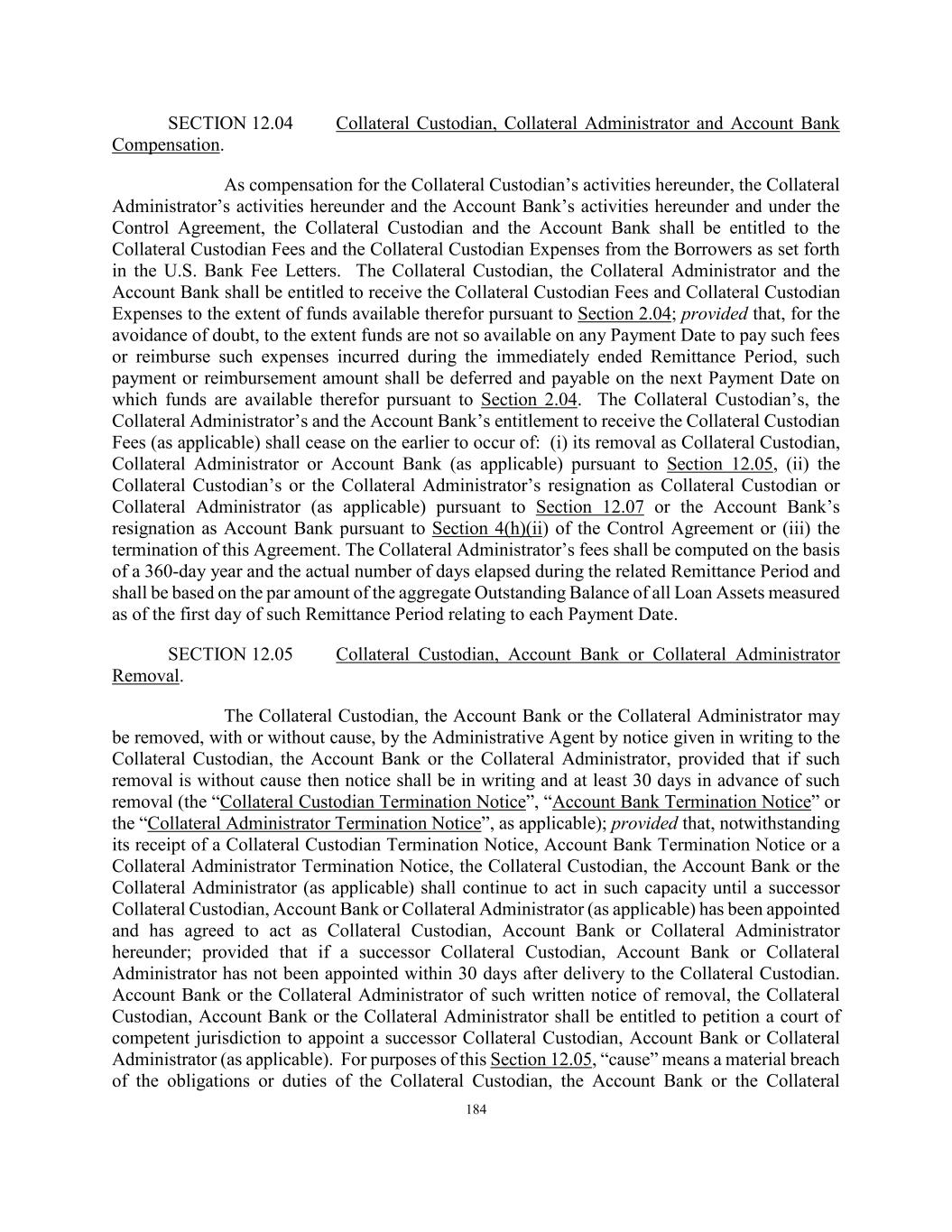184 SECTION 12.04 Collateral Custodian, Collateral Administrator and Account Bank Compensation. As compensation for the Collateral Custodian’s activities hereunder, the Collateral Administrator’s activities hereunder and the Account Bank’s activities hereunder and under the Control Agreement, the Collateral Custodian and the Account Bank shall be entitled to the Collateral Custodian Fees and the Collateral Custodian Expenses from the Borrowers as set forth in the U.S. Bank Fee Letters. The Collateral Custodian, the Collateral Administrator and the Account Bank shall be entitled to receive the Collateral Custodian Fees and Collateral Custodian Expenses to the extent of funds available therefor pursuant to Section 2.04; provided that, for the avoidance of doubt, to the extent funds are not so available on any Payment Date to pay such fees or reimburse such expenses incurred during the immediately ended Remittance Period, such payment or reimbursement amount shall be deferred and payable on the next Payment Date on which funds are available therefor pursuant to Section 2.04. The Collateral Custodian’s, the Collateral Administrator’s and the Account Bank’s entitlement to receive the Collateral Custodian Fees (as applicable) shall cease on the earlier to occur of: (i) its removal as Collateral Custodian, Collateral Administrator or Account Bank (as applicable) pursuant to Section 12.05, (ii) the Collateral Custodian’s or the Collateral Administrator’s resignation as Collateral Custodian or Collateral Administrator (as applicable) pursuant to Section 12.07 or the Account Bank’s resignation as Account Bank pursuant to Section 4(h)(ii) of the Control Agreement or (iii) the termination of this Agreement. The Collateral Administrator’s fees shall be computed on the basis of a 360-day year and the actual number of days elapsed during the related Remittance Period and shall be based on the par amount of the aggregate Outstanding Balance of all Loan Assets measured as of the first day of such Remittance Period relating to each Payment Date. SECTION 12.05 Collateral Custodian, Account Bank or Collateral Administrator Removal. The Collateral Custodian, the Account Bank or the Collateral Administrator may be removed, with or without cause, by the Administrative Agent by notice given in writing to the Collateral Custodian, the Account Bank or the Collateral Administrator, provided that if such removal is without cause then notice shall be in writing and at least 30 days in advance of such removal (the “Collateral Custodian Termination Notice”, “Account Bank Termination Notice” or the “Collateral Administrator Termination Notice”, as applicable); provided that, notwithstanding its receipt of a Collateral Custodian Termination Notice, Account Bank Termination Notice or a Collateral Administrator Termination Notice, the Collateral Custodian, the Account Bank or the Collateral Administrator (as applicable) shall continue to act in such capacity until a successor Collateral Custodian, Account Bank or Collateral Administrator (as applicable) has been appointed and has agreed to act as Collateral Custodian, Account Bank or Collateral Administrator hereunder; provided that if a successor Collateral Custodian, Account Bank or Collateral Administrator has not been appointed within 30 days after delivery to the Collateral Custodian. Account Bank or the Collateral Administrator of such written notice of removal, the Collateral Custodian, Account Bank or the Collateral Administrator shall be entitled to petition a court of competent jurisdiction to appoint a successor Collateral Custodian, Account Bank or Collateral Administrator (as applicable). For purposes of this Section 12.05, “cause” means a material breach of the obligations or duties of the Collateral Custodian, the Account Bank or the Collateral