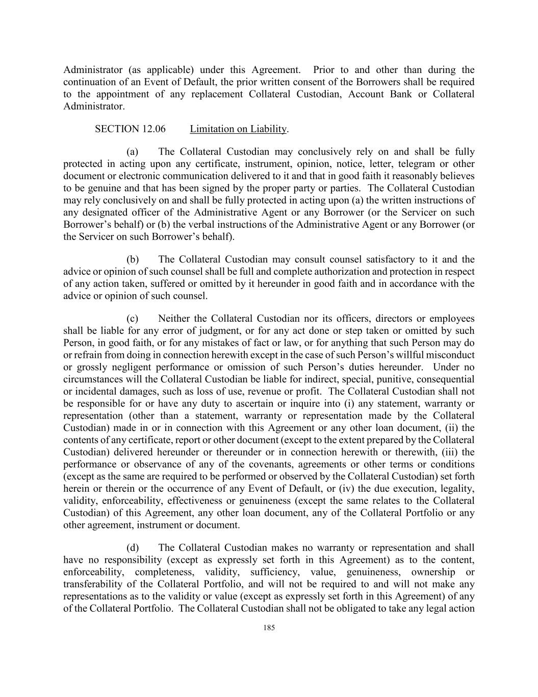 185 Administrator (as applicable) under this Agreement. Prior to and other than during the continuation of an Event of Default, the prior written consent of the Borrowers shall be required to the appointment of any replacement Collateral Custodian, Account Bank or Collateral Administrator. SECTION 12.06 Limitation on Liability. (a) The Collateral Custodian may conclusively rely on and shall be fully protected in acting upon any certificate, instrument, opinion, notice, letter, telegram or other document or electronic communication delivered to it and that in good faith it reasonably believes to be genuine and that has been signed by the proper party or parties. The Collateral Custodian may rely conclusively on and shall be fully protected in acting upon (a) the written instructions of any designated officer of the Administrative Agent or any Borrower (or the Servicer on such Borrower’s behalf) or (b) the verbal instructions of the Administrative Agent or any Borrower (or the Servicer on such Borrower’s behalf). (b) The Collateral Custodian may consult counsel satisfactory to it and the advice or opinion of such counsel shall be full and complete authorization and protection in respect of any action taken, suffered or omitted by it hereunder in good faith and in accordance with the advice or opinion of such counsel. (c) Neither the Collateral Custodian nor its officers, directors or employees shall be liable for any error of judgment, or for any act done or step taken or omitted by such Person, in good faith, or for any mistakes of fact or law, or for anything that such Person may do or refrain from doing in connection herewith except in the case of such Person’s willful misconduct or grossly negligent performance or omission of such Person’s duties hereunder. Under no circumstances will the Collateral Custodian be liable for indirect, special, punitive, consequential or incidental damages, such as loss of use, revenue or profit. The Collateral Custodian shall not be responsible for or have any duty to ascertain or inquire into (i) any statement, warranty or representation (other than a statement, warranty or representation made by the Collateral Custodian) made in or in connection with this Agreement or any other loan document, (ii) the contents of any certificate, report or other document (except to the extent prepared by the Collateral Custodian) delivered hereunder or thereunder or in connection herewith or therewith, (iii) the performance or observance of any of the covenants, agreements or other terms or conditions (except as the same are required to be performed or observed by the Collateral Custodian) set forth herein or therein or the occurrence of any Event of Default, or (iv) the due execution, legality, validity, enforceability, effectiveness or genuineness (except the same relates to the Collateral Custodian) of this Agreement, any other loan document, any of the Collateral Portfolio or any other agreement, instrument or document. (d) The Collateral Custodian makes no warranty or representation and shall have no responsibility (except as expressly set forth in this Agreement) as to the content, enforceability, completeness, validity, sufficiency, value, genuineness, ownership or transferability of the Collateral Portfolio, and will not be required to and will not make any representations as to the validity or value (except as expressly set forth in this Agreement) of any of the Collateral Portfolio. The Collateral Custodian shall not be obligated to take any legal action