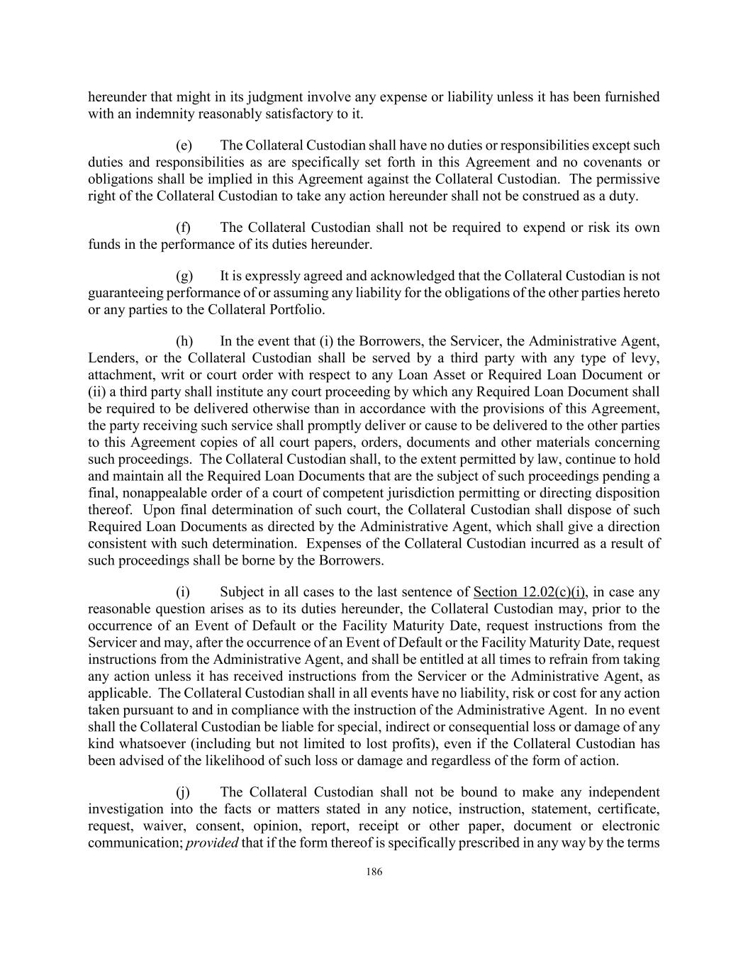 186 hereunder that might in its judgment involve any expense or liability unless it has been furnished with an indemnity reasonably satisfactory to it. (e) The Collateral Custodian shall have no duties or responsibilities except such duties and responsibilities as are specifically set forth in this Agreement and no covenants or obligations shall be implied in this Agreement against the Collateral Custodian. The permissive right of the Collateral Custodian to take any action hereunder shall not be construed as a duty. (f) The Collateral Custodian shall not be required to expend or risk its own funds in the performance of its duties hereunder. (g) It is expressly agreed and acknowledged that the Collateral Custodian is not guaranteeing performance of or assuming any liability for the obligations of the other parties hereto or any parties to the Collateral Portfolio. (h) In the event that (i) the Borrowers, the Servicer, the Administrative Agent, Lenders, or the Collateral Custodian shall be served by a third party with any type of levy, attachment, writ or court order with respect to any Loan Asset or Required Loan Document or (ii) a third party shall institute any court proceeding by which any Required Loan Document shall be required to be delivered otherwise than in accordance with the provisions of this Agreement, the party receiving such service shall promptly deliver or cause to be delivered to the other parties to this Agreement copies of all court papers, orders, documents and other materials concerning such proceedings. The Collateral Custodian shall, to the extent permitted by law, continue to hold and maintain all the Required Loan Documents that are the subject of such proceedings pending a final, nonappealable order of a court of competent jurisdiction permitting or directing disposition thereof. Upon final determination of such court, the Collateral Custodian shall dispose of such Required Loan Documents as directed by the Administrative Agent, which shall give a direction consistent with such determination. Expenses of the Collateral Custodian incurred as a result of such proceedings shall be borne by the Borrowers. (i) Subject in all cases to the last sentence of Section 12.02(c)(i), in case any reasonable question arises as to its duties hereunder, the Collateral Custodian may, prior to the occurrence of an Event of Default or the Facility Maturity Date, request instructions from the Servicer and may, after the occurrence of an Event of Default or the Facility Maturity Date, request instructions from the Administrative Agent, and shall be entitled at all times to refrain from taking any action unless it has received instructions from the Servicer or the Administrative Agent, as applicable. The Collateral Custodian shall in all events have no liability, risk or cost for any action taken pursuant to and in compliance with the instruction of the Administrative Agent. In no event shall the Collateral Custodian be liable for special, indirect or consequential loss or damage of any kind whatsoever (including but not limited to lost profits), even if the Collateral Custodian has been advised of the likelihood of such loss or damage and regardless of the form of action. (j) The Collateral Custodian shall not be bound to make any independent investigation into the facts or matters stated in any notice, instruction, statement, certificate, request, waiver, consent, opinion, report, receipt or other paper, document or electronic communication; provided that if the form thereof is specifically prescribed in any way by the terms