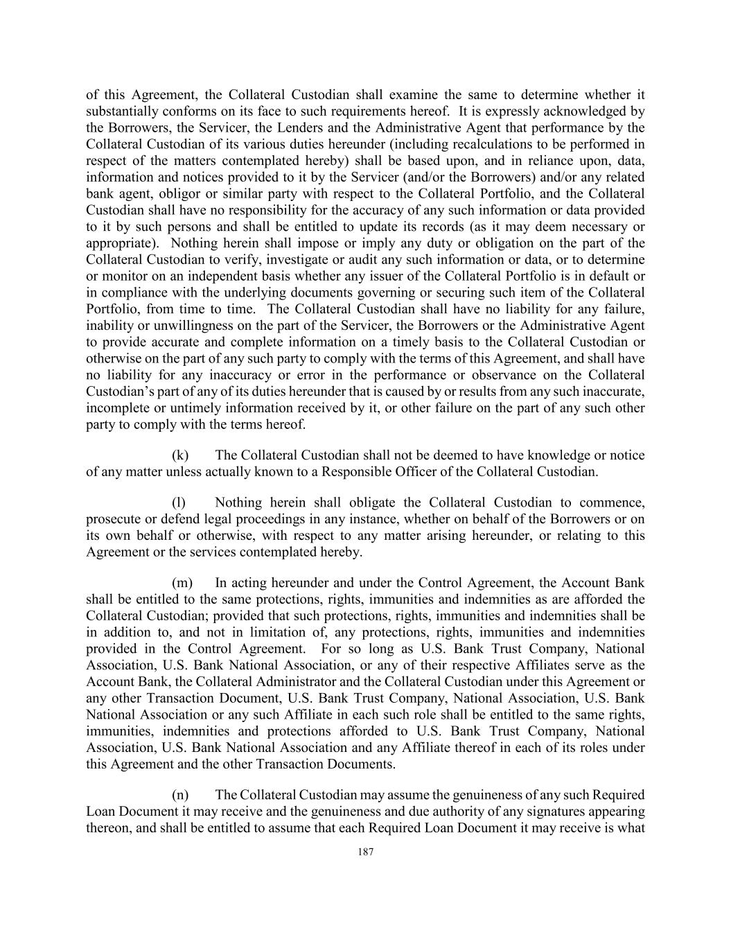 187 of this Agreement, the Collateral Custodian shall examine the same to determine whether it substantially conforms on its face to such requirements hereof. It is expressly acknowledged by the Borrowers, the Servicer, the Lenders and the Administrative Agent that performance by the Collateral Custodian of its various duties hereunder (including recalculations to be performed in respect of the matters contemplated hereby) shall be based upon, and in reliance upon, data, information and notices provided to it by the Servicer (and/or the Borrowers) and/or any related bank agent, obligor or similar party with respect to the Collateral Portfolio, and the Collateral Custodian shall have no responsibility for the accuracy of any such information or data provided to it by such persons and shall be entitled to update its records (as it may deem necessary or appropriate). Nothing herein shall impose or imply any duty or obligation on the part of the Collateral Custodian to verify, investigate or audit any such information or data, or to determine or monitor on an independent basis whether any issuer of the Collateral Portfolio is in default or in compliance with the underlying documents governing or securing such item of the Collateral Portfolio, from time to time. The Collateral Custodian shall have no liability for any failure, inability or unwillingness on the part of the Servicer, the Borrowers or the Administrative Agent to provide accurate and complete information on a timely basis to the Collateral Custodian or otherwise on the part of any such party to comply with the terms of this Agreement, and shall have no liability for any inaccuracy or error in the performance or observance on the Collateral Custodian’s part of any of its duties hereunder that is caused by or results from any such inaccurate, incomplete or untimely information received by it, or other failure on the part of any such other party to comply with the terms hereof. (k) The Collateral Custodian shall not be deemed to have knowledge or notice of any matter unless actually known to a Responsible Officer of the Collateral Custodian. (l) Nothing herein shall obligate the Collateral Custodian to commence, prosecute or defend legal proceedings in any instance, whether on behalf of the Borrowers or on its own behalf or otherwise, with respect to any matter arising hereunder, or relating to this Agreement or the services contemplated hereby. (m) In acting hereunder and under the Control Agreement, the Account Bank shall be entitled to the same protections, rights, immunities and indemnities as are afforded the Collateral Custodian; provided that such protections, rights, immunities and indemnities shall be in addition to, and not in limitation of, any protections, rights, immunities and indemnities provided in the Control Agreement. For so long as U.S. Bank Trust Company, National Association, U.S. Bank National Association, or any of their respective Affiliates serve as the Account Bank, the Collateral Administrator and the Collateral Custodian under this Agreement or any other Transaction Document, U.S. Bank Trust Company, National Association, U.S. Bank National Association or any such Affiliate in each such role shall be entitled to the same rights, immunities, indemnities and protections afforded to U.S. Bank Trust Company, National Association, U.S. Bank National Association and any Affiliate thereof in each of its roles under this Agreement and the other Transaction Documents. (n) The Collateral Custodian may assume the genuineness of any such Required Loan Document it may receive and the genuineness and due authority of any signatures appearing thereon, and shall be entitled to assume that each Required Loan Document it may receive is what