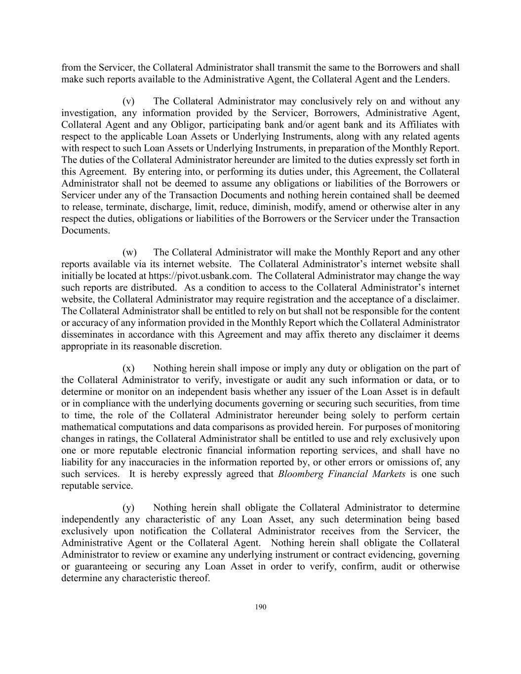 190 from the Servicer, the Collateral Administrator shall transmit the same to the Borrowers and shall make such reports available to the Administrative Agent, the Collateral Agent and the Lenders. (v) The Collateral Administrator may conclusively rely on and without any investigation, any information provided by the Servicer, Borrowers, Administrative Agent, Collateral Agent and any Obligor, participating bank and/or agent bank and its Affiliates with respect to the applicable Loan Assets or Underlying Instruments, along with any related agents with respect to such Loan Assets or Underlying Instruments, in preparation of the Monthly Report. The duties of the Collateral Administrator hereunder are limited to the duties expressly set forth in this Agreement. By entering into, or performing its duties under, this Agreement, the Collateral Administrator shall not be deemed to assume any obligations or liabilities of the Borrowers or Servicer under any of the Transaction Documents and nothing herein contained shall be deemed to release, terminate, discharge, limit, reduce, diminish, modify, amend or otherwise alter in any respect the duties, obligations or liabilities of the Borrowers or the Servicer under the Transaction Documents. (w) The Collateral Administrator will make the Monthly Report and any other reports available via its internet website. The Collateral Administrator’s internet website shall initially be located at https://pivot.usbank.com. The Collateral Administrator may change the way such reports are distributed. As a condition to access to the Collateral Administrator’s internet website, the Collateral Administrator may require registration and the acceptance of a disclaimer. The Collateral Administrator shall be entitled to rely on but shall not be responsible for the content or accuracy of any information provided in the Monthly Report which the Collateral Administrator disseminates in accordance with this Agreement and may affix thereto any disclaimer it deems appropriate in its reasonable discretion. (x) Nothing herein shall impose or imply any duty or obligation on the part of the Collateral Administrator to verify, investigate or audit any such information or data, or to determine or monitor on an independent basis whether any issuer of the Loan Asset is in default or in compliance with the underlying documents governing or securing such securities, from time to time, the role of the Collateral Administrator hereunder being solely to perform certain mathematical computations and data comparisons as provided herein. For purposes of monitoring changes in ratings, the Collateral Administrator shall be entitled to use and rely exclusively upon one or more reputable electronic financial information reporting services, and shall have no liability for any inaccuracies in the information reported by, or other errors or omissions of, any such services. It is hereby expressly agreed that Bloomberg Financial Markets is one such reputable service. (y) Nothing herein shall obligate the Collateral Administrator to determine independently any characteristic of any Loan Asset, any such determination being based exclusively upon notification the Collateral Administrator receives from the Servicer, the Administrative Agent or the Collateral Agent. Nothing herein shall obligate the Collateral Administrator to review or examine any underlying instrument or contract evidencing, governing or guaranteeing or securing any Loan Asset in order to verify, confirm, audit or otherwise determine any characteristic thereof.