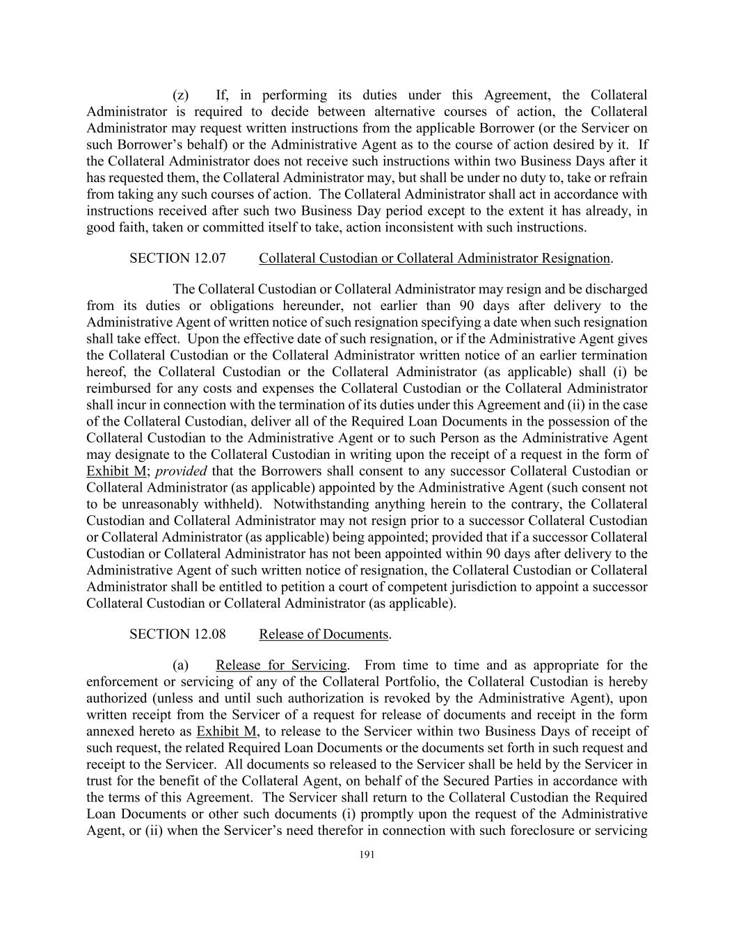 191 (z) If, in performing its duties under this Agreement, the Collateral Administrator is required to decide between alternative courses of action, the Collateral Administrator may request written instructions from the applicable Borrower (or the Servicer on such Borrower’s behalf) or the Administrative Agent as to the course of action desired by it. If the Collateral Administrator does not receive such instructions within two Business Days after it has requested them, the Collateral Administrator may, but shall be under no duty to, take or refrain from taking any such courses of action. The Collateral Administrator shall act in accordance with instructions received after such two Business Day period except to the extent it has already, in good faith, taken or committed itself to take, action inconsistent with such instructions. SECTION 12.07 Collateral Custodian or Collateral Administrator Resignation. The Collateral Custodian or Collateral Administrator may resign and be discharged from its duties or obligations hereunder, not earlier than 90 days after delivery to the Administrative Agent of written notice of such resignation specifying a date when such resignation shall take effect. Upon the effective date of such resignation, or if the Administrative Agent gives the Collateral Custodian or the Collateral Administrator written notice of an earlier termination hereof, the Collateral Custodian or the Collateral Administrator (as applicable) shall (i) be reimbursed for any costs and expenses the Collateral Custodian or the Collateral Administrator shall incur in connection with the termination of its duties under this Agreement and (ii) in the case of the Collateral Custodian, deliver all of the Required Loan Documents in the possession of the Collateral Custodian to the Administrative Agent or to such Person as the Administrative Agent may designate to the Collateral Custodian in writing upon the receipt of a request in the form of Exhibit M; provided that the Borrowers shall consent to any successor Collateral Custodian or Collateral Administrator (as applicable) appointed by the Administrative Agent (such consent not to be unreasonably withheld). Notwithstanding anything herein to the contrary, the Collateral Custodian and Collateral Administrator may not resign prior to a successor Collateral Custodian or Collateral Administrator (as applicable) being appointed; provided that if a successor Collateral Custodian or Collateral Administrator has not been appointed within 90 days after delivery to the Administrative Agent of such written notice of resignation, the Collateral Custodian or Collateral Administrator shall be entitled to petition a court of competent jurisdiction to appoint a successor Collateral Custodian or Collateral Administrator (as applicable). SECTION 12.08 Release of Documents. (a) Release for Servicing. From time to time and as appropriate for the enforcement or servicing of any of the Collateral Portfolio, the Collateral Custodian is hereby authorized (unless and until such authorization is revoked by the Administrative Agent), upon written receipt from the Servicer of a request for release of documents and receipt in the form annexed hereto as Exhibit M, to release to the Servicer within two Business Days of receipt of such request, the related Required Loan Documents or the documents set forth in such request and receipt to the Servicer. All documents so released to the Servicer shall be held by the Servicer in trust for the benefit of the Collateral Agent, on behalf of the Secured Parties in accordance with the terms of this Agreement. The Servicer shall return to the Collateral Custodian the Required Loan Documents or other such documents (i) promptly upon the request of the Administrative Agent, or (ii) when the Servicer’s need therefor in connection with such foreclosure or servicing