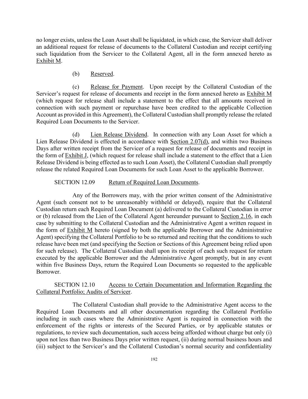 192 no longer exists, unless the Loan Asset shall be liquidated, in which case, the Servicer shall deliver an additional request for release of documents to the Collateral Custodian and receipt certifying such liquidation from the Servicer to the Collateral Agent, all in the form annexed hereto as Exhibit M. (b) Reserved. (c) Release for Payment. Upon receipt by the Collateral Custodian of the Servicer’s request for release of documents and receipt in the form annexed hereto as Exhibit M (which request for release shall include a statement to the effect that all amounts received in connection with such payment or repurchase have been credited to the applicable Collection Account as provided in this Agreement), the Collateral Custodian shall promptly release the related Required Loan Documents to the Servicer. (d) Lien Release Dividend. In connection with any Loan Asset for which a Lien Release Dividend is effected in accordance with Section 2.07(d), and within two Business Days after written receipt from the Servicer of a request for release of documents and receipt in the form of Exhibit J, (which request for release shall include a statement to the effect that a Lien Release Dividend is being effected as to such Loan Asset), the Collateral Custodian shall promptly release the related Required Loan Documents for such Loan Asset to the applicable Borrower. SECTION 12.09 Return of Required Loan Documents. Any of the Borrowers may, with the prior written consent of the Administrative Agent (such consent not to be unreasonably withheld or delayed), require that the Collateral Custodian return each Required Loan Document (a) delivered to the Collateral Custodian in error or (b) released from the Lien of the Collateral Agent hereunder pursuant to Section 2.16, in each case by submitting to the Collateral Custodian and the Administrative Agent a written request in the form of Exhibit M hereto (signed by both the applicable Borrower and the Administrative Agent) specifying the Collateral Portfolio to be so returned and reciting that the conditions to such release have been met (and specifying the Section or Sections of this Agreement being relied upon for such release). The Collateral Custodian shall upon its receipt of each such request for return executed by the applicable Borrower and the Administrative Agent promptly, but in any event within five Business Days, return the Required Loan Documents so requested to the applicable Borrower. SECTION 12.10 Access to Certain Documentation and Information Regarding the Collateral Portfolio; Audits of Servicer. The Collateral Custodian shall provide to the Administrative Agent access to the Required Loan Documents and all other documentation regarding the Collateral Portfolio including in such cases where the Administrative Agent is required in connection with the enforcement of the rights or interests of the Secured Parties, or by applicable statutes or regulations, to review such documentation, such access being afforded without charge but only (i) upon not less than two Business Days prior written request, (ii) during normal business hours and (iii) subject to the Servicer’s and the Collateral Custodian’s normal security and confidentiality