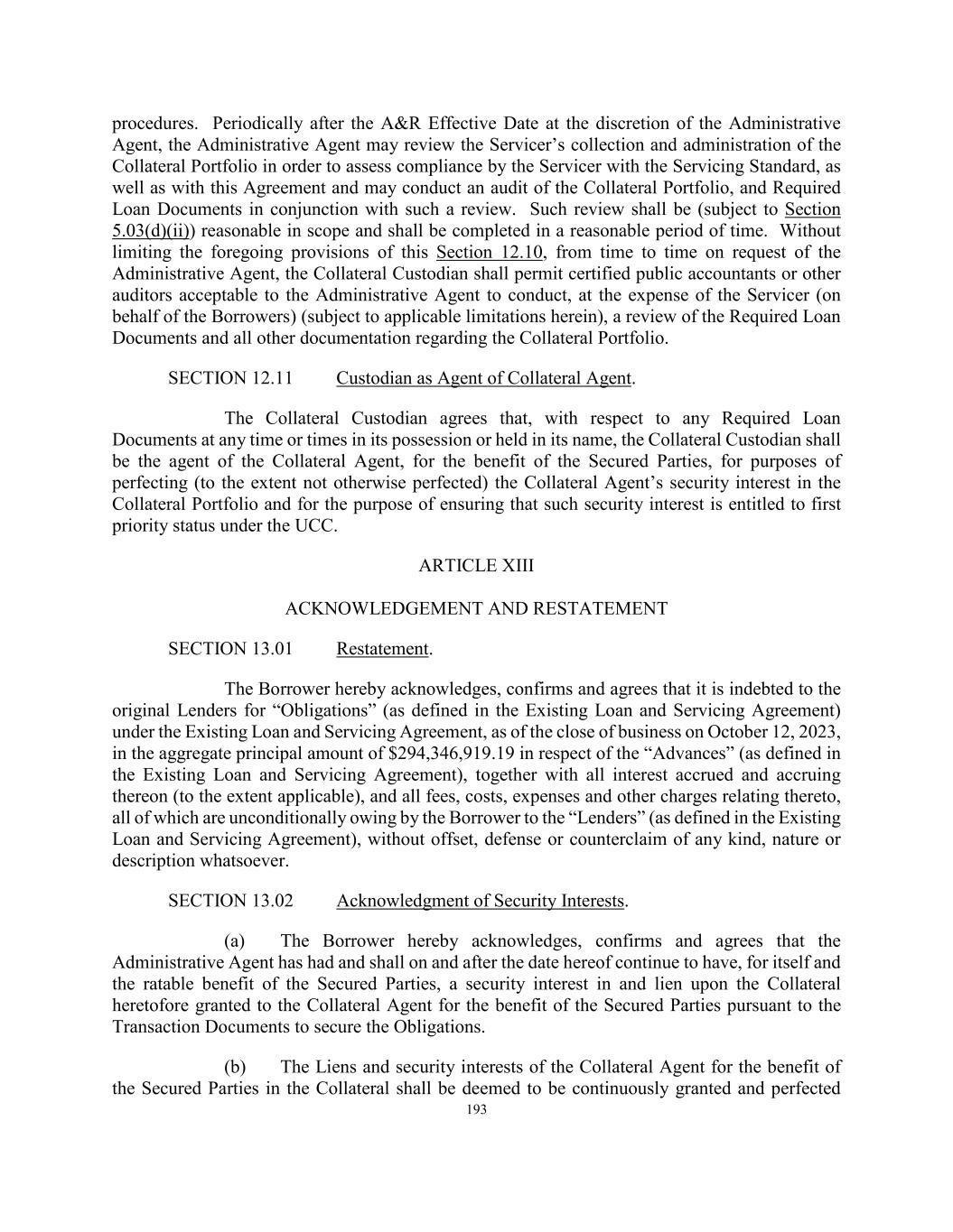 193 procedures. Periodically after the A&R Effective Date at the discretion of the Administrative Agent, the Administrative Agent may review the Servicer’s collection and administration of the Collateral Portfolio in order to assess compliance by the Servicer with the Servicing Standard, as well as with this Agreement and may conduct an audit of the Collateral Portfolio, and Required Loan Documents in conjunction with such a review. Such review shall be (subject to Section 5.03(d)(ii)) reasonable in scope and shall be completed in a reasonable period of time. Without limiting the foregoing provisions of this Section 12.10, from time to time on request of the Administrative Agent, the Collateral Custodian shall permit certified public accountants or other auditors acceptable to the Administrative Agent to conduct, at the expense of the Servicer (on behalf of the Borrowers) (subject to applicable limitations herein), a review of the Required Loan Documents and all other documentation regarding the Collateral Portfolio. SECTION 12.11 Custodian as Agent of Collateral Agent. The Collateral Custodian agrees that, with respect to any Required Loan Documents at any time or times in its possession or held in its name, the Collateral Custodian shall be the agent of the Collateral Agent, for the benefit of the Secured Parties, for purposes of perfecting (to the extent not otherwise perfected) the Collateral Agent’s security interest in the Collateral Portfolio and for the purpose of ensuring that such security interest is entitled to first priority status under the UCC. ARTICLE XIII ACKNOWLEDGEMENT AND RESTATEMENT SECTION 13.01 Restatement. The Borrower hereby acknowledges, confirms and agrees that it is indebted to the original Lenders for “Obligations” (as defined in the Existing Loan and Servicing Agreement) under the Existing Loan and Servicing Agreement, as of the close of business on October 12, 2023, in the aggregate principal amount of $294,346,919.19 in respect of the “Advances” (as defined in the Existing Loan and Servicing Agreement), together with all interest accrued and accruing thereon (to the extent applicable), and all fees, costs, expenses and other charges relating thereto, all of which are unconditionally owing by the Borrower to the “Lenders” (as defined in the Existing Loan and Servicing Agreement), without offset, defense or counterclaim of any kind, nature or description whatsoever. SECTION 13.02 Acknowledgment of Security Interests. (a) The Borrower hereby acknowledges, confirms and agrees that the Administrative Agent has had and shall on and after the date hereof continue to have, for itself and the ratable benefit of the Secured Parties, a security interest in and lien upon the Collateral heretofore granted to the Collateral Agent for the benefit of the Secured Parties pursuant to the Transaction Documents to secure the Obligations. (b) The Liens and security interests of the Collateral Agent for the benefit of the Secured Parties in the Collateral shall be deemed to be continuously granted and perfected