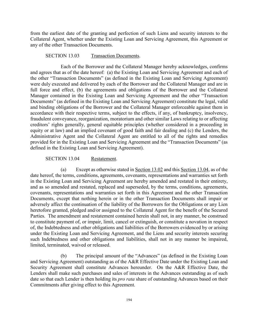 194 from the earliest date of the granting and perfection of such Liens and security interests to the Collateral Agent, whether under the Existing Loan and Servicing Agreement, this Agreement or any of the other Transaction Documents. SECTION 13.03 Transaction Documents. Each of the Borrower and the Collateral Manager hereby acknowledges, confirms and agrees that as of the date hereof: (a) the Existing Loan and Servicing Agreement and each of the other “Transaction Documents” (as defined in the Existing Loan and Servicing Agreement) were duly executed and delivered by each of the Borrower and the Collateral Manager and are in full force and effect, (b) the agreements and obligations of the Borrower and the Collateral Manager contained in the Existing Loan and Servicing Agreement and the other “Transaction Documents” (as defined in the Existing Loan and Servicing Agreement) constitute the legal, valid and binding obligations of the Borrower and the Collateral Manager enforceable against them in accordance with their respective terms, subject to the effects, if any, of bankruptcy, insolvency, fraudulent conveyance, reorganization, moratorium and other similar Laws relating to or affecting creditors’ rights generally, general equitable principles (whether considered in a proceeding in equity or at law) and an implied covenant of good faith and fair dealing and (c) the Lenders, the Administrative Agent and the Collateral Agent are entitled to all of the rights and remedies provided for in the Existing Loan and Servicing Agreement and the “Transaction Documents” (as defined in the Existing Loan and Servicing Agreement). SECTION 13.04 Restatement. (a) Except as otherwise stated in Section 13.02 and this Section 13.04, as of the date hereof, the terms, conditions, agreements, covenants, representations and warranties set forth in the Existing Loan and Servicing Agreement are hereby amended and restated in their entirety, and as so amended and restated, replaced and superseded, by the terms, conditions, agreements, covenants, representations and warranties set forth in this Agreement and the other Transaction Documents, except that nothing herein or in the other Transaction Documents shall impair or adversely affect the continuation of the liability of the Borrowers for the Obligations or any Lien heretofore granted, pledged and/or assigned to the Collateral Agent for the benefit of the Secured Parties. The amendment and restatement contained herein shall not, in any manner, be construed to constitute payment of, or impair, limit, cancel or extinguish, or constitute a novation in respect of, the Indebtedness and other obligations and liabilities of the Borrowers evidenced by or arising under the Existing Loan and Servicing Agreement, and the Liens and security interests securing such Indebtedness and other obligations and liabilities, shall not in any manner be impaired, limited, terminated, waived or released. (b) The principal amount of the “Advances” (as defined in the Existing Loan and Servicing Agreement) outstanding as of the A&R Effective Date under the Existing Loan and Security Agreement shall constitute Advances hereunder. On the A&R Effective Date, the Lenders shall make such purchases and sales of interests in the Advances outstanding as of such date so that each Lender is then holding its pro rata share of outstanding Advances based on their Commitments after giving effect to this Agreement.