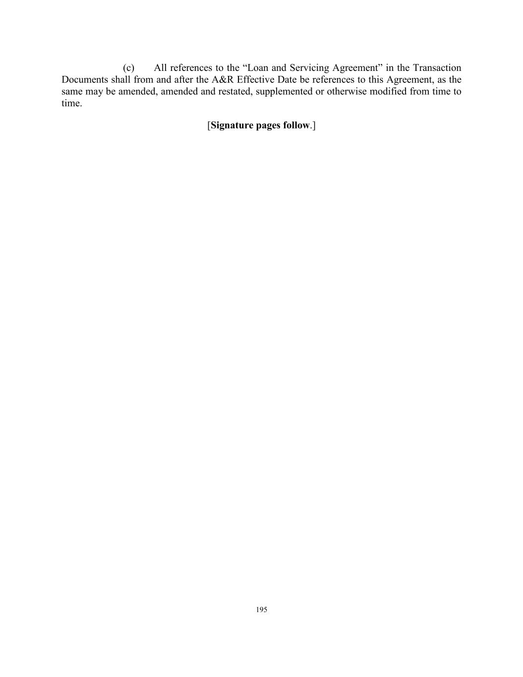195 (c) All references to the “Loan and Servicing Agreement” in the Transaction Documents shall from and after the A&R Effective Date be references to this Agreement, as the same may be amended, amended and restated, supplemented or otherwise modified from time to time. [Signature pages follow.]