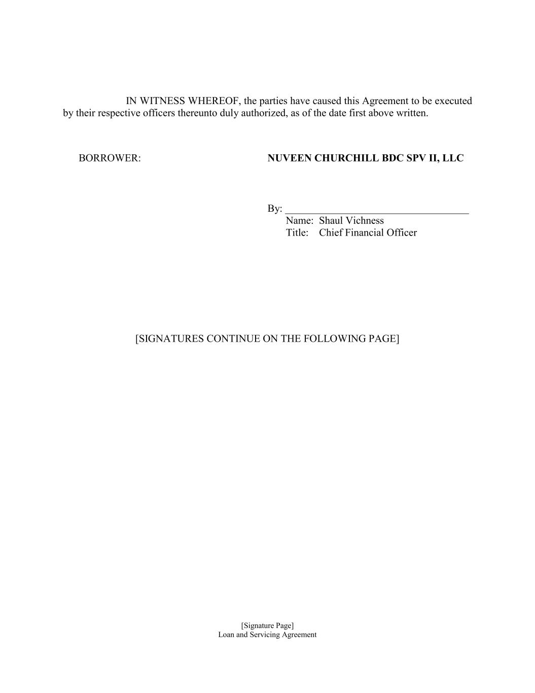 [Signature Page] Loan and Servicing Agreement IN WITNESS WHEREOF, the parties have caused this Agreement to be executed by their respective officers thereunto duly authorized, as of the date first above written. BORROWER: NUVEEN CHURCHILL BDC SPV II, LLC By: ___________________________________ Name: Shaul Vichness Title: Chief Financial Officer [SIGNATURES CONTINUE ON THE FOLLOWING PAGE]