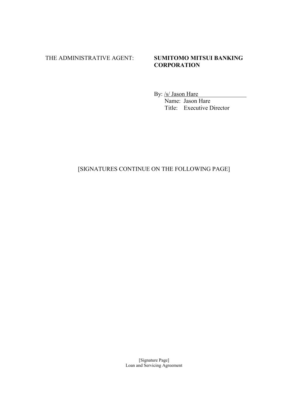 [Signature Page] Loan and Servicing Agreement THE ADMINISTRATIVE AGENT: SUMITOMO MITSUI BANKING CORPORATION By: /s/ Jason Hare________________ Name: Jason Hare Title: Executive Director [SIGNATURES CONTINUE ON THE FOLLOWING PAGE]