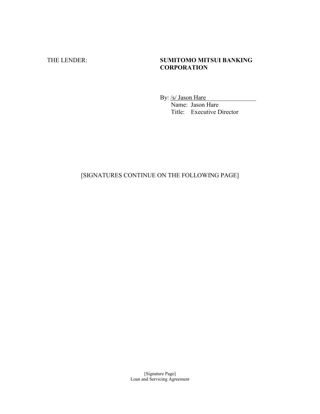 [Signature Page] Loan and Servicing Agreement THE LENDER: SUMITOMO MITSUI BANKING CORPORATION By: /s/ Jason Hare________________ Name: Jason Hare Title: Executive Director [SIGNATURES CONTINUE ON THE FOLLOWING PAGE]