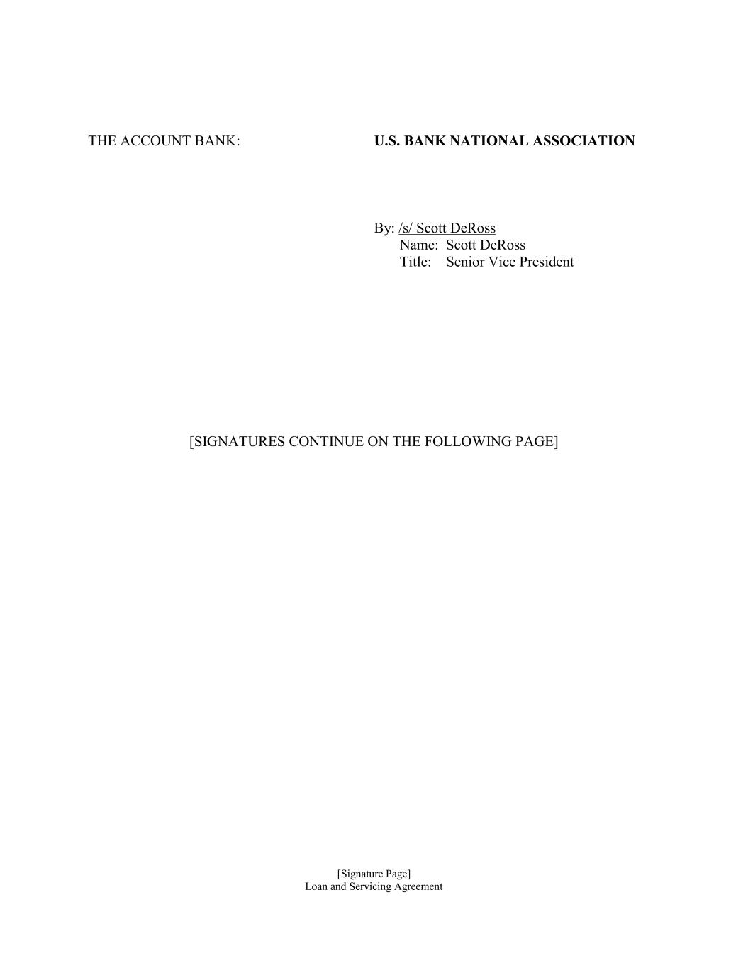 [Signature Page] Loan and Servicing Agreement THE ACCOUNT BANK: U.S. BANK NATIONAL ASSOCIATION By: /s/ Scott DeRoss Name: Scott DeRoss Title: Senior Vice President [SIGNATURES CONTINUE ON THE FOLLOWING PAGE]