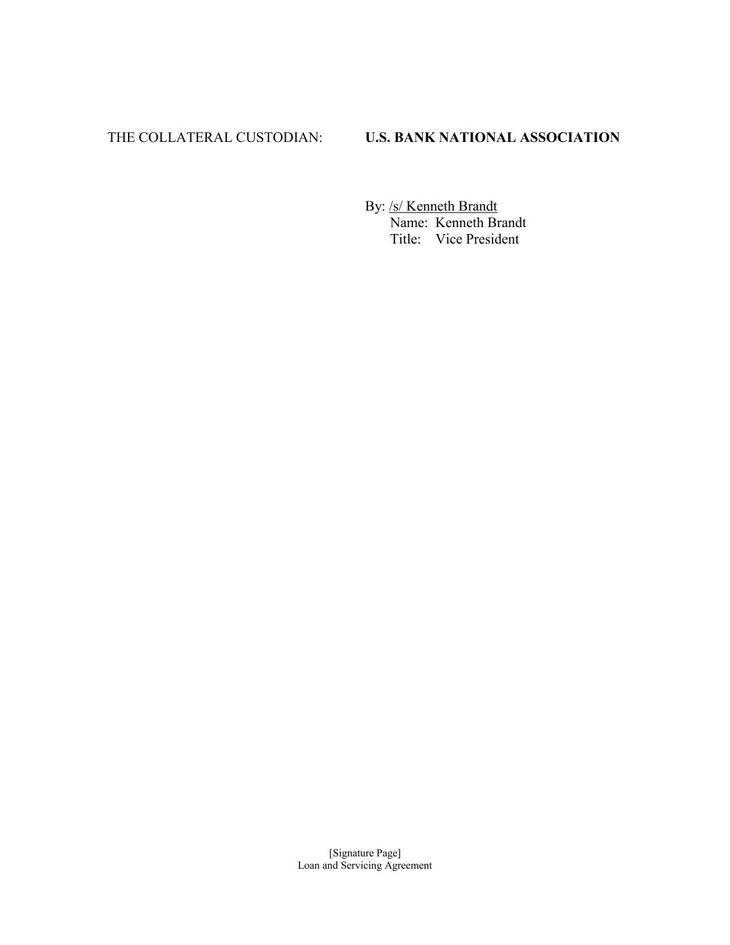 [Signature Page] Loan and Servicing Agreement THE COLLATERAL CUSTODIAN: U.S. BANK NATIONAL ASSOCIATION By: /s/ Kenneth Brandt Name: Kenneth Brandt Title: Vice President