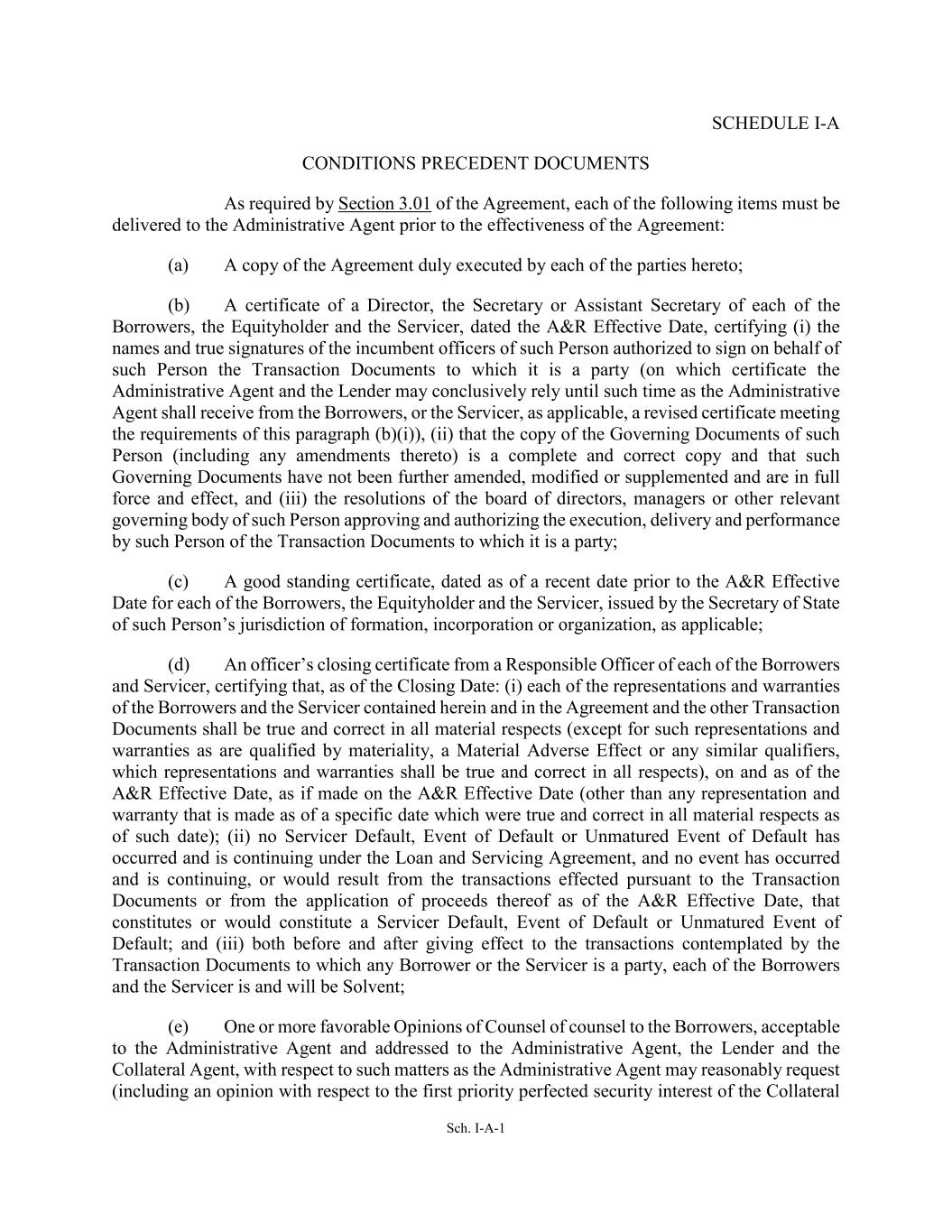 Sch. I-A-1 SCHEDULE I-A CONDITIONS PRECEDENT DOCUMENTS As required by Section 3.01 of the Agreement, each of the following items must be delivered to the Administrative Agent prior to the effectiveness of the Agreement: (a) A copy of the Agreement duly executed by each of the parties hereto; (b) A certificate of a Director, the Secretary or Assistant Secretary of each of the Borrowers, the Equityholder and the Servicer, dated the A&R Effective Date, certifying (i) the names and true signatures of the incumbent officers of such Person authorized to sign on behalf of such Person the Transaction Documents to which it is a party (on which certificate the Administrative Agent and the Lender may conclusively rely until such time as the Administrative Agent shall receive from the Borrowers, or the Servicer, as applicable, a revised certificate meeting the requirements of this paragraph (b)(i)), (ii) that the copy of the Governing Documents of such Person (including any amendments thereto) is a complete and correct copy and that such Governing Documents have not been further amended, modified or supplemented and are in full force and effect, and (iii) the resolutions of the board of directors, managers or other relevant governing body of such Person approving and authorizing the execution, delivery and performance by such Person of the Transaction Documents to which it is a party; (c) A good standing certificate, dated as of a recent date prior to the A&R Effective Date for each of the Borrowers, the Equityholder and the Servicer, issued by the Secretary of State of such Person’s jurisdiction of formation, incorporation or organization, as applicable; (d) An officer’s closing certificate from a Responsible Officer of each of the Borrowers and Servicer, certifying that, as of the Closing Date: (i) each of the representations and warranties of the Borrowers and the Servicer contained herein and in the Agreement and the other Transaction Documents shall be true and correct in all material respects (except for such representations and warranties as are qualified by materiality, a Material Adverse Effect or any similar qualifiers, which representations and warranties shall be true and correct in all respects), on and as of the A&R Effective Date, as if made on the A&R Effective Date (other than any representation and warranty that is made as of a specific date which were true and correct in all material respects as of such date); (ii) no Servicer Default, Event of Default or Unmatured Event of Default has occurred and is continuing under the Loan and Servicing Agreement, and no event has occurred and is continuing, or would result from the transactions effected pursuant to the Transaction Documents or from the application of proceeds thereof as of the A&R Effective Date, that constitutes or would constitute a Servicer Default, Event of Default or Unmatured Event of Default; and (iii) both before and after giving effect to the transactions contemplated by the Transaction Documents to which any Borrower or the Servicer is a party, each of the Borrowers and the Servicer is and will be Solvent; (e) One or more favorable Opinions of Counsel of counsel to the Borrowers, acceptable to the Administrative Agent and addressed to the Administrative Agent, the Lender and the Collateral Agent, with respect to such matters as the Administrative Agent may reasonably request (including an opinion with respect to the first priority perfected security interest of the Collateral