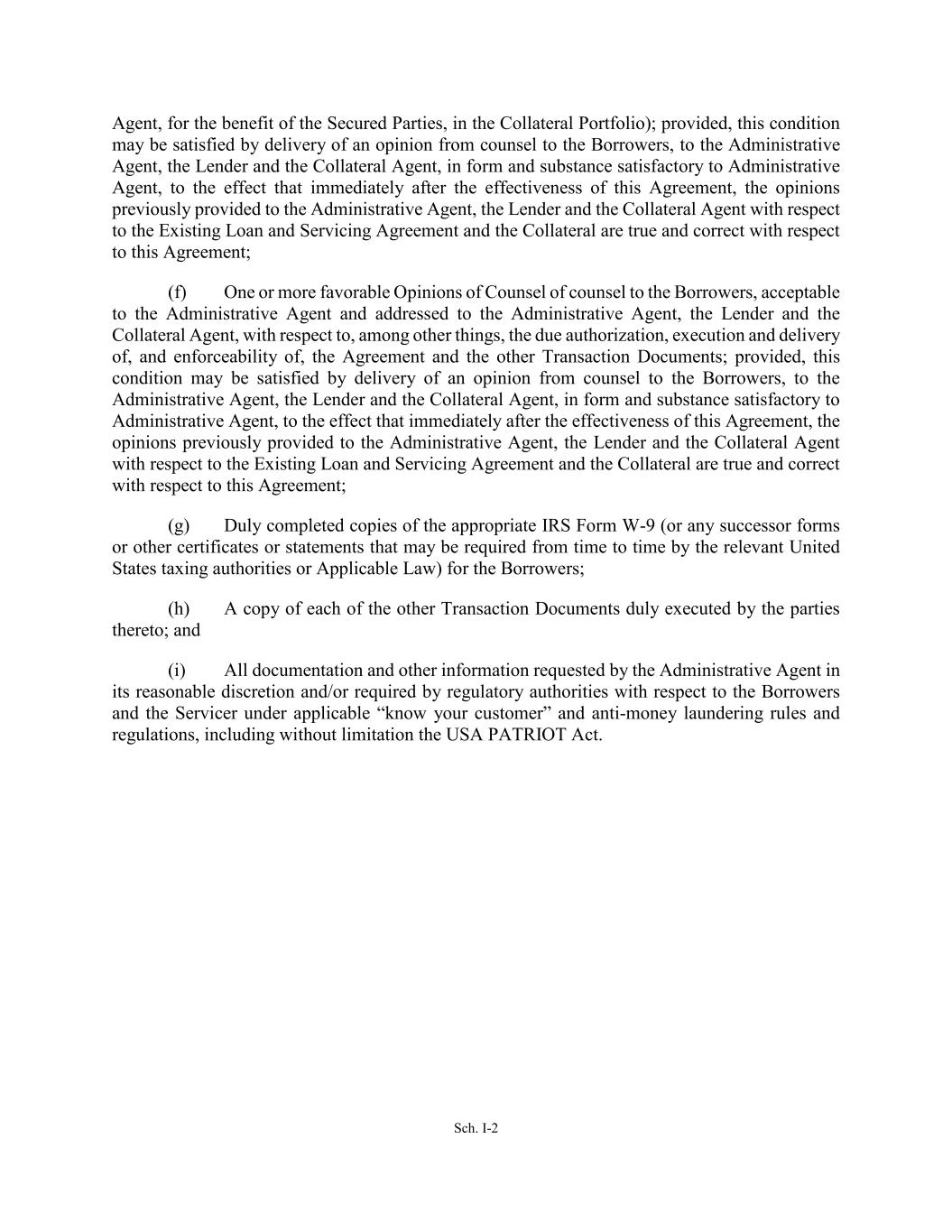 Sch. I-2 Agent, for the benefit of the Secured Parties, in the Collateral Portfolio); provided, this condition may be satisfied by delivery of an opinion from counsel to the Borrowers, to the Administrative Agent, the Lender and the Collateral Agent, in form and substance satisfactory to Administrative Agent, to the effect that immediately after the effectiveness of this Agreement, the opinions previously provided to the Administrative Agent, the Lender and the Collateral Agent with respect to the Existing Loan and Servicing Agreement and the Collateral are true and correct with respect to this Agreement; (f) One or more favorable Opinions of Counsel of counsel to the Borrowers, acceptable to the Administrative Agent and addressed to the Administrative Agent, the Lender and the Collateral Agent, with respect to, among other things, the due authorization, execution and delivery of, and enforceability of, the Agreement and the other Transaction Documents; provided, this condition may be satisfied by delivery of an opinion from counsel to the Borrowers, to the Administrative Agent, the Lender and the Collateral Agent, in form and substance satisfactory to Administrative Agent, to the effect that immediately after the effectiveness of this Agreement, the opinions previously provided to the Administrative Agent, the Lender and the Collateral Agent with respect to the Existing Loan and Servicing Agreement and the Collateral are true and correct with respect to this Agreement; (g) Duly completed copies of the appropriate IRS Form W-9 (or any successor forms or other certificates or statements that may be required from time to time by the relevant United States taxing authorities or Applicable Law) for the Borrowers; (h) A copy of each of the other Transaction Documents duly executed by the parties thereto; and (i) All documentation and other information requested by the Administrative Agent in its reasonable discretion and/or required by regulatory authorities with respect to the Borrowers and the Servicer under applicable “know your customer” and anti-money laundering rules and regulations, including without limitation the USA PATRIOT Act.