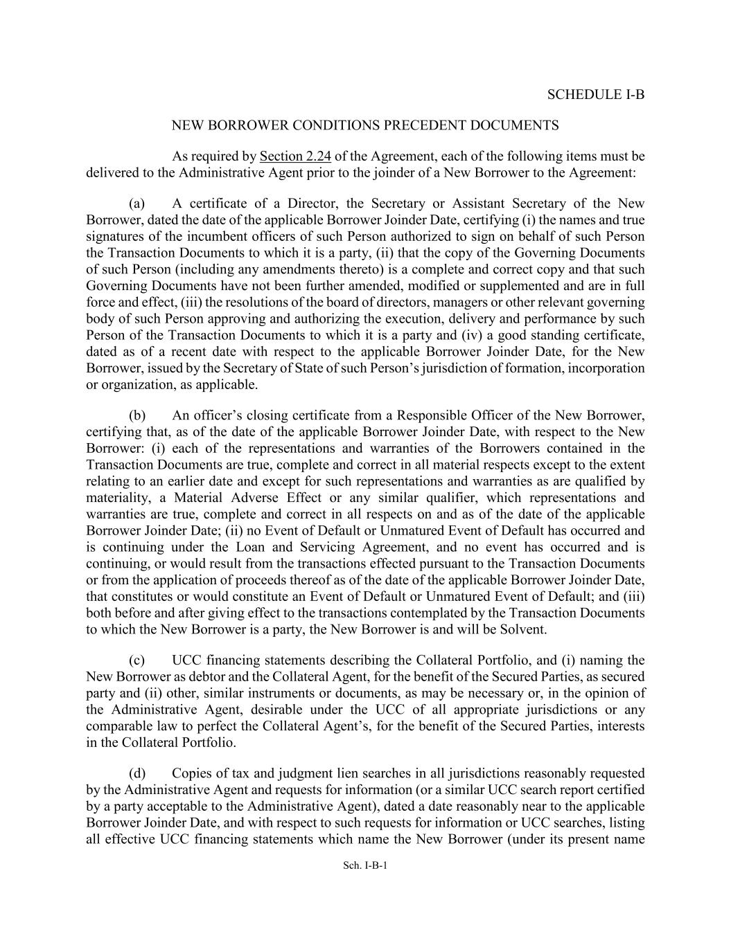 Sch. I-B-1 SCHEDULE I-B NEW BORROWER CONDITIONS PRECEDENT DOCUMENTS As required by Section 2.24 of the Agreement, each of the following items must be delivered to the Administrative Agent prior to the joinder of a New Borrower to the Agreement: (a) A certificate of a Director, the Secretary or Assistant Secretary of the New Borrower, dated the date of the applicable Borrower Joinder Date, certifying (i) the names and true signatures of the incumbent officers of such Person authorized to sign on behalf of such Person the Transaction Documents to which it is a party, (ii) that the copy of the Governing Documents of such Person (including any amendments thereto) is a complete and correct copy and that such Governing Documents have not been further amended, modified or supplemented and are in full force and effect, (iii) the resolutions of the board of directors, managers or other relevant governing body of such Person approving and authorizing the execution, delivery and performance by such Person of the Transaction Documents to which it is a party and (iv) a good standing certificate, dated as of a recent date with respect to the applicable Borrower Joinder Date, for the New Borrower, issued by the Secretary of State of such Person’s jurisdiction of formation, incorporation or organization, as applicable. (b) An officer’s closing certificate from a Responsible Officer of the New Borrower, certifying that, as of the date of the applicable Borrower Joinder Date, with respect to the New Borrower: (i) each of the representations and warranties of the Borrowers contained in the Transaction Documents are true, complete and correct in all material respects except to the extent relating to an earlier date and except for such representations and warranties as are qualified by materiality, a Material Adverse Effect or any similar qualifier, which representations and warranties are true, complete and correct in all respects on and as of the date of the applicable Borrower Joinder Date; (ii) no Event of Default or Unmatured Event of Default has occurred and is continuing under the Loan and Servicing Agreement, and no event has occurred and is continuing, or would result from the transactions effected pursuant to the Transaction Documents or from the application of proceeds thereof as of the date of the applicable Borrower Joinder Date, that constitutes or would constitute an Event of Default or Unmatured Event of Default; and (iii) both before and after giving effect to the transactions contemplated by the Transaction Documents to which the New Borrower is a party, the New Borrower is and will be Solvent. (c) UCC financing statements describing the Collateral Portfolio, and (i) naming the New Borrower as debtor and the Collateral Agent, for the benefit of the Secured Parties, as secured party and (ii) other, similar instruments or documents, as may be necessary or, in the opinion of the Administrative Agent, desirable under the UCC of all appropriate jurisdictions or any comparable law to perfect the Collateral Agent’s, for the benefit of the Secured Parties, interests in the Collateral Portfolio. (d) Copies of tax and judgment lien searches in all jurisdictions reasonably requested by the Administrative Agent and requests for information (or a similar UCC search report certified by a party acceptable to the Administrative Agent), dated a date reasonably near to the applicable Borrower Joinder Date, and with respect to such requests for information or UCC searches, listing all effective UCC financing statements which name the New Borrower (under its present name