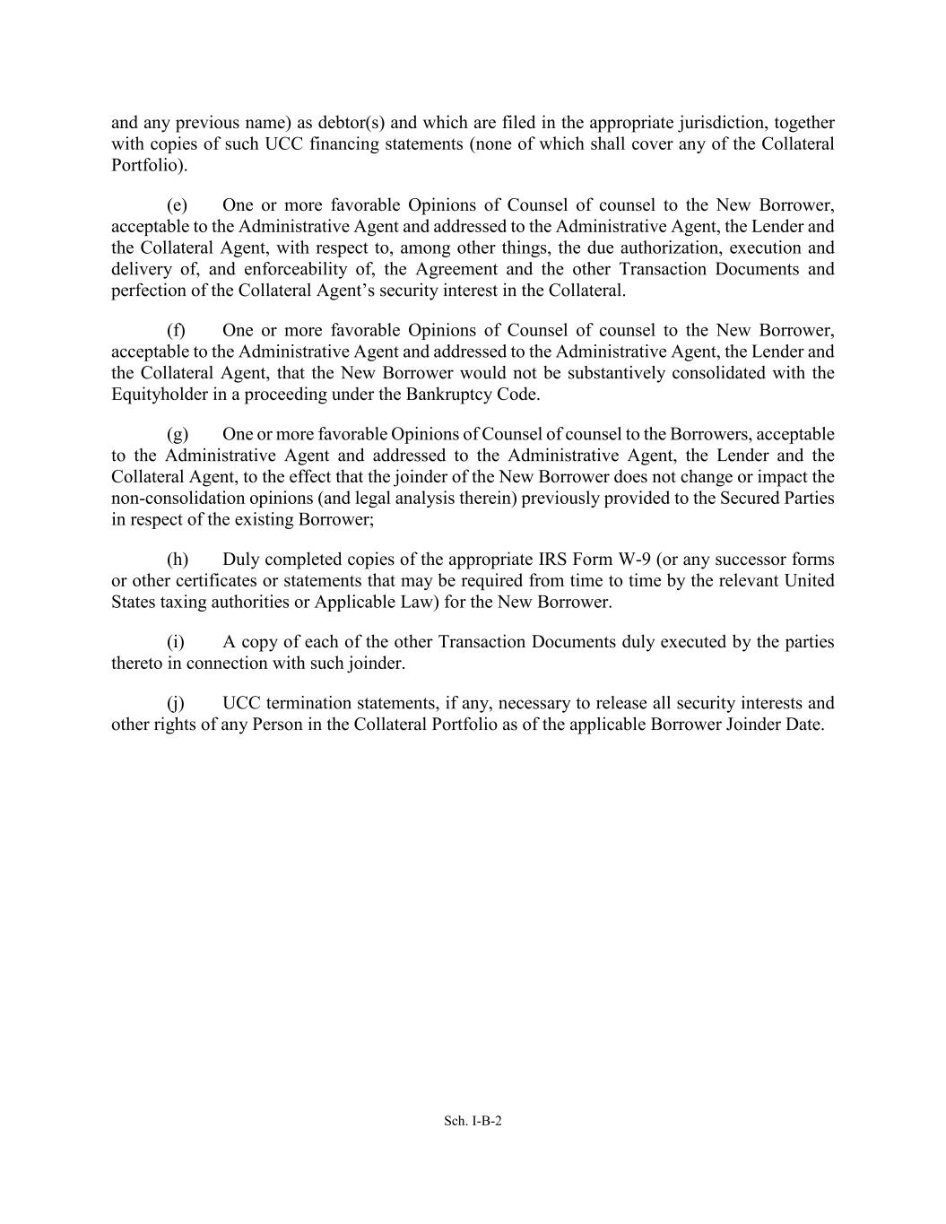 Sch. I-B-2 and any previous name) as debtor(s) and which are filed in the appropriate jurisdiction, together with copies of such UCC financing statements (none of which shall cover any of the Collateral Portfolio). (e) One or more favorable Opinions of Counsel of counsel to the New Borrower, acceptable to the Administrative Agent and addressed to the Administrative Agent, the Lender and the Collateral Agent, with respect to, among other things, the due authorization, execution and delivery of, and enforceability of, the Agreement and the other Transaction Documents and perfection of the Collateral Agent’s security interest in the Collateral. (f) One or more favorable Opinions of Counsel of counsel to the New Borrower, acceptable to the Administrative Agent and addressed to the Administrative Agent, the Lender and the Collateral Agent, that the New Borrower would not be substantively consolidated with the Equityholder in a proceeding under the Bankruptcy Code. (g) One or more favorable Opinions of Counsel of counsel to the Borrowers, acceptable to the Administrative Agent and addressed to the Administrative Agent, the Lender and the Collateral Agent, to the effect that the joinder of the New Borrower does not change or impact the non-consolidation opinions (and legal analysis therein) previously provided to the Secured Parties in respect of the existing Borrower; (h) Duly completed copies of the appropriate IRS Form W-9 (or any successor forms or other certificates or statements that may be required from time to time by the relevant United States taxing authorities or Applicable Law) for the New Borrower. (i) A copy of each of the other Transaction Documents duly executed by the parties thereto in connection with such joinder. (j) UCC termination statements, if any, necessary to release all security interests and other rights of any Person in the Collateral Portfolio as of the applicable Borrower Joinder Date.