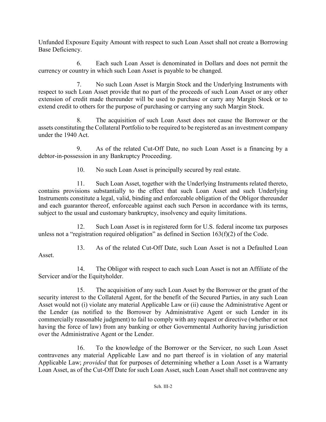 Sch. III-2 Unfunded Exposure Equity Amount with respect to such Loan Asset shall not create a Borrowing Base Deficiency. 6. Each such Loan Asset is denominated in Dollars and does not permit the currency or country in which such Loan Asset is payable to be changed. 7. No such Loan Asset is Margin Stock and the Underlying Instruments with respect to such Loan Asset provide that no part of the proceeds of such Loan Asset or any other extension of credit made thereunder will be used to purchase or carry any Margin Stock or to extend credit to others for the purpose of purchasing or carrying any such Margin Stock. 8. The acquisition of such Loan Asset does not cause the Borrower or the assets constituting the Collateral Portfolio to be required to be registered as an investment company under the 1940 Act. 9. As of the related Cut-Off Date, no such Loan Asset is a financing by a debtor-in-possession in any Bankruptcy Proceeding. 10. No such Loan Asset is principally secured by real estate. 11. Such Loan Asset, together with the Underlying Instruments related thereto, contains provisions substantially to the effect that such Loan Asset and such Underlying Instruments constitute a legal, valid, binding and enforceable obligation of the Obligor thereunder and each guarantor thereof, enforceable against each such Person in accordance with its terms, subject to the usual and customary bankruptcy, insolvency and equity limitations. 12. Such Loan Asset is in registered form for U.S. federal income tax purposes unless not a “registration required obligation” as defined in Section 163(f)(2) of the Code. 13. As of the related Cut-Off Date, such Loan Asset is not a Defaulted Loan Asset. 14. The Obligor with respect to each such Loan Asset is not an Affiliate of the Servicer and/or the Equityholder. 15. The acquisition of any such Loan Asset by the Borrower or the grant of the security interest to the Collateral Agent, for the benefit of the Secured Parties, in any such Loan Asset would not (i) violate any material Applicable Law or (ii) cause the Administrative Agent or the Lender (as notified to the Borrower by Administrative Agent or such Lender in its commercially reasonable judgment) to fail to comply with any request or directive (whether or not having the force of law) from any banking or other Governmental Authority having jurisdiction over the Administrative Agent or the Lender. 16. To the knowledge of the Borrower or the Servicer, no such Loan Asset contravenes any material Applicable Law and no part thereof is in violation of any material Applicable Law; provided that for purposes of determining whether a Loan Asset is a Warranty Loan Asset, as of the Cut-Off Date for such Loan Asset, such Loan Asset shall not contravene any