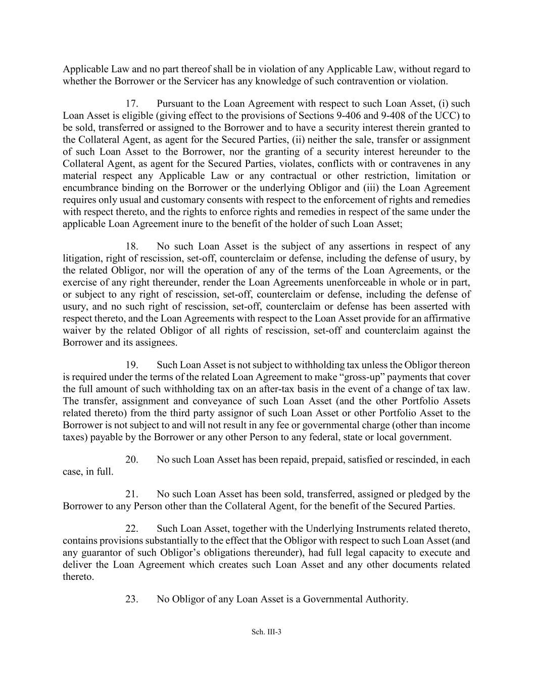 Sch. III-3 Applicable Law and no part thereof shall be in violation of any Applicable Law, without regard to whether the Borrower or the Servicer has any knowledge of such contravention or violation. 17. Pursuant to the Loan Agreement with respect to such Loan Asset, (i) such Loan Asset is eligible (giving effect to the provisions of Sections 9-406 and 9-408 of the UCC) to be sold, transferred or assigned to the Borrower and to have a security interest therein granted to the Collateral Agent, as agent for the Secured Parties, (ii) neither the sale, transfer or assignment of such Loan Asset to the Borrower, nor the granting of a security interest hereunder to the Collateral Agent, as agent for the Secured Parties, violates, conflicts with or contravenes in any material respect any Applicable Law or any contractual or other restriction, limitation or encumbrance binding on the Borrower or the underlying Obligor and (iii) the Loan Agreement requires only usual and customary consents with respect to the enforcement of rights and remedies with respect thereto, and the rights to enforce rights and remedies in respect of the same under the applicable Loan Agreement inure to the benefit of the holder of such Loan Asset; 18. No such Loan Asset is the subject of any assertions in respect of any litigation, right of rescission, set-off, counterclaim or defense, including the defense of usury, by the related Obligor, nor will the operation of any of the terms of the Loan Agreements, or the exercise of any right thereunder, render the Loan Agreements unenforceable in whole or in part, or subject to any right of rescission, set-off, counterclaim or defense, including the defense of usury, and no such right of rescission, set-off, counterclaim or defense has been asserted with respect thereto, and the Loan Agreements with respect to the Loan Asset provide for an affirmative waiver by the related Obligor of all rights of rescission, set-off and counterclaim against the Borrower and its assignees. 19. Such Loan Asset is not subject to withholding tax unless the Obligor thereon is required under the terms of the related Loan Agreement to make “gross-up” payments that cover the full amount of such withholding tax on an after-tax basis in the event of a change of tax law. The transfer, assignment and conveyance of such Loan Asset (and the other Portfolio Assets related thereto) from the third party assignor of such Loan Asset or other Portfolio Asset to the Borrower is not subject to and will not result in any fee or governmental charge (other than income taxes) payable by the Borrower or any other Person to any federal, state or local government. 20. No such Loan Asset has been repaid, prepaid, satisfied or rescinded, in each case, in full. 21. No such Loan Asset has been sold, transferred, assigned or pledged by the Borrower to any Person other than the Collateral Agent, for the benefit of the Secured Parties. 22. Such Loan Asset, together with the Underlying Instruments related thereto, contains provisions substantially to the effect that the Obligor with respect to such Loan Asset (and any guarantor of such Obligor’s obligations thereunder), had full legal capacity to execute and deliver the Loan Agreement which creates such Loan Asset and any other documents related thereto. 23. No Obligor of any Loan Asset is a Governmental Authority.