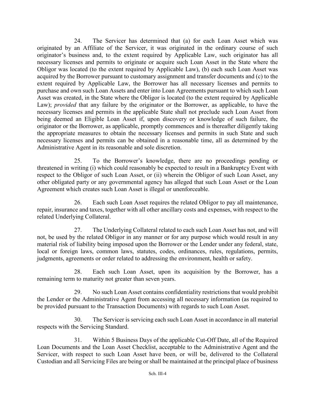 Sch. III-4 24. The Servicer has determined that (a) for each Loan Asset which was originated by an Affiliate of the Servicer, it was originated in the ordinary course of such originator’s business and, to the extent required by Applicable Law, such originator has all necessary licenses and permits to originate or acquire such Loan Asset in the State where the Obligor was located (to the extent required by Applicable Law), (b) each such Loan Asset was acquired by the Borrower pursuant to customary assignment and transfer documents and (c) to the extent required by Applicable Law, the Borrower has all necessary licenses and permits to purchase and own such Loan Assets and enter into Loan Agreements pursuant to which such Loan Asset was created, in the State where the Obligor is located (to the extent required by Applicable Law); provided that any failure by the originator or the Borrower, as applicable, to have the necessary licenses and permits in the applicable State shall not preclude such Loan Asset from being deemed an Eligible Loan Asset if, upon discovery or knowledge of such failure, the originator or the Borrower, as applicable, promptly commences and is thereafter diligently taking the appropriate measures to obtain the necessary licenses and permits in such State and such necessary licenses and permits can be obtained in a reasonable time, all as determined by the Administrative Agent in its reasonable and sole discretion. 25. To the Borrower’s knowledge, there are no proceedings pending or threatened in writing (i) which could reasonably be expected to result in a Bankruptcy Event with respect to the Obligor of such Loan Asset, or (ii) wherein the Obligor of such Loan Asset, any other obligated party or any governmental agency has alleged that such Loan Asset or the Loan Agreement which creates such Loan Asset is illegal or unenforceable. 26. Each such Loan Asset requires the related Obligor to pay all maintenance, repair, insurance and taxes, together with all other ancillary costs and expenses, with respect to the related Underlying Collateral. 27. The Underlying Collateral related to each such Loan Asset has not, and will not, be used by the related Obligor in any manner or for any purpose which would result in any material risk of liability being imposed upon the Borrower or the Lender under any federal, state, local or foreign laws, common laws, statutes, codes, ordinances, rules, regulations, permits, judgments, agreements or order related to addressing the environment, health or safety. 28. Each such Loan Asset, upon its acquisition by the Borrower, has a remaining term to maturity not greater than seven years. 29. No such Loan Asset contains confidentiality restrictions that would prohibit the Lender or the Administrative Agent from accessing all necessary information (as required to be provided pursuant to the Transaction Documents) with regards to such Loan Asset. 30. The Servicer is servicing each such Loan Asset in accordance in all material respects with the Servicing Standard. 31. Within 5 Business Days of the applicable Cut-Off Date, all of the Required Loan Documents and the Loan Asset Checklist, acceptable to the Administrative Agent and the Servicer, with respect to such Loan Asset have been, or will be, delivered to the Collateral Custodian and all Servicing Files are being or shall be maintained at the principal place of business
