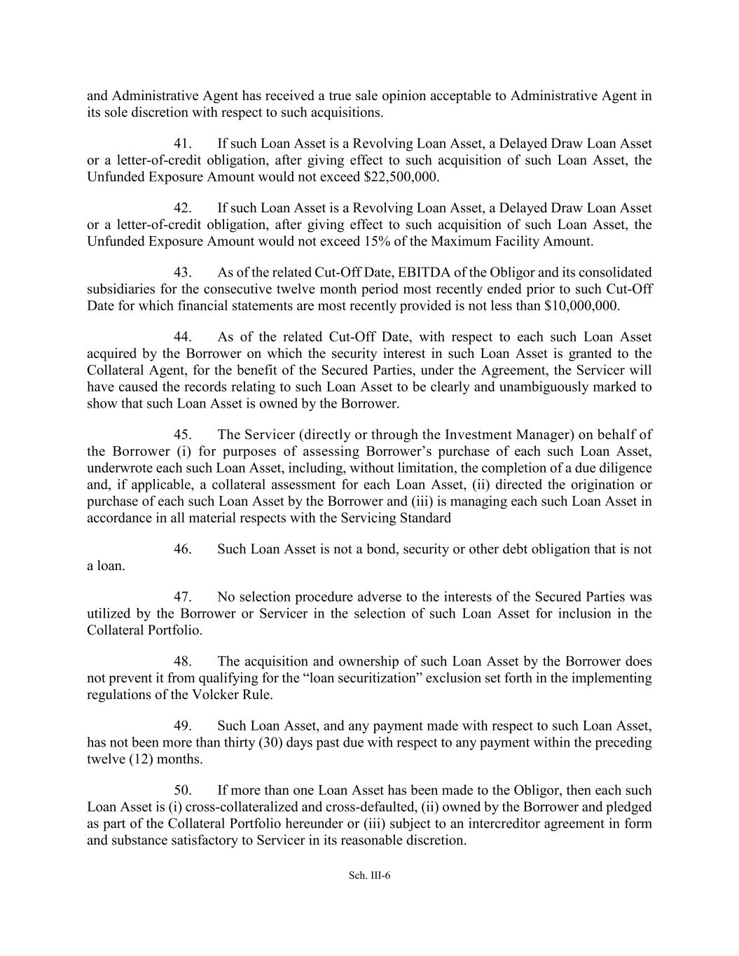 Sch. III-6 and Administrative Agent has received a true sale opinion acceptable to Administrative Agent in its sole discretion with respect to such acquisitions. 41. If such Loan Asset is a Revolving Loan Asset, a Delayed Draw Loan Asset or a letter-of-credit obligation, after giving effect to such acquisition of such Loan Asset, the Unfunded Exposure Amount would not exceed $22,500,000. 42. If such Loan Asset is a Revolving Loan Asset, a Delayed Draw Loan Asset or a letter-of-credit obligation, after giving effect to such acquisition of such Loan Asset, the Unfunded Exposure Amount would not exceed 15% of the Maximum Facility Amount. 43. As of the related Cut-Off Date, EBITDA of the Obligor and its consolidated subsidiaries for the consecutive twelve month period most recently ended prior to such Cut-Off Date for which financial statements are most recently provided is not less than $10,000,000. 44. As of the related Cut-Off Date, with respect to each such Loan Asset acquired by the Borrower on which the security interest in such Loan Asset is granted to the Collateral Agent, for the benefit of the Secured Parties, under the Agreement, the Servicer will have caused the records relating to such Loan Asset to be clearly and unambiguously marked to show that such Loan Asset is owned by the Borrower. 45. The Servicer (directly or through the Investment Manager) on behalf of the Borrower (i) for purposes of assessing Borrower’s purchase of each such Loan Asset, underwrote each such Loan Asset, including, without limitation, the completion of a due diligence and, if applicable, a collateral assessment for each Loan Asset, (ii) directed the origination or purchase of each such Loan Asset by the Borrower and (iii) is managing each such Loan Asset in accordance in all material respects with the Servicing Standard 46. Such Loan Asset is not a bond, security or other debt obligation that is not a loan. 47. No selection procedure adverse to the interests of the Secured Parties was utilized by the Borrower or Servicer in the selection of such Loan Asset for inclusion in the Collateral Portfolio. 48. The acquisition and ownership of such Loan Asset by the Borrower does not prevent it from qualifying for the “loan securitization” exclusion set forth in the implementing regulations of the Volcker Rule. 49. Such Loan Asset, and any payment made with respect to such Loan Asset, has not been more than thirty (30) days past due with respect to any payment within the preceding twelve (12) months. 50. If more than one Loan Asset has been made to the Obligor, then each such Loan Asset is (i) cross-collateralized and cross-defaulted, (ii) owned by the Borrower and pledged as part of the Collateral Portfolio hereunder or (iii) subject to an intercreditor agreement in form and substance satisfactory to Servicer in its reasonable discretion.