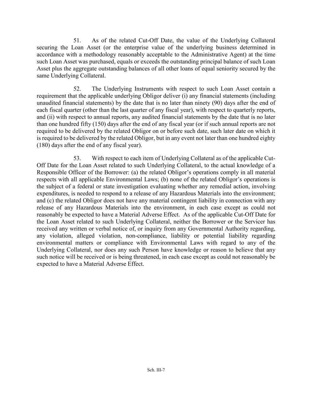 Sch. III-7 51. As of the related Cut-Off Date, the value of the Underlying Collateral securing the Loan Asset (or the enterprise value of the underlying business determined in accordance with a methodology reasonably acceptable to the Administrative Agent) at the time such Loan Asset was purchased, equals or exceeds the outstanding principal balance of such Loan Asset plus the aggregate outstanding balances of all other loans of equal seniority secured by the same Underlying Collateral. 52. The Underlying Instruments with respect to such Loan Asset contain a requirement that the applicable underlying Obligor deliver (i) any financial statements (including unaudited financial statements) by the date that is no later than ninety (90) days after the end of each fiscal quarter (other than the last quarter of any fiscal year), with respect to quarterly reports, and (ii) with respect to annual reports, any audited financial statements by the date that is no later than one hundred fifty (150) days after the end of any fiscal year (or if such annual reports are not required to be delivered by the related Obligor on or before such date, such later date on which it is required to be delivered by the related Obligor, but in any event not later than one hundred eighty (180) days after the end of any fiscal year). 53. With respect to each item of Underlying Collateral as of the applicable Cut- Off Date for the Loan Asset related to such Underlying Collateral, to the actual knowledge of a Responsible Officer of the Borrower: (a) the related Obligor’s operations comply in all material respects with all applicable Environmental Laws; (b) none of the related Obligor’s operations is the subject of a federal or state investigation evaluating whether any remedial action, involving expenditures, is needed to respond to a release of any Hazardous Materials into the environment; and (c) the related Obligor does not have any material contingent liability in connection with any release of any Hazardous Materials into the environment, in each case except as could not reasonably be expected to have a Material Adverse Effect. As of the applicable Cut-Off Date for the Loan Asset related to such Underlying Collateral, neither the Borrower or the Servicer has received any written or verbal notice of, or inquiry from any Governmental Authority regarding, any violation, alleged violation, non-compliance, liability or potential liability regarding environmental matters or compliance with Environmental Laws with regard to any of the Underlying Collateral, nor does any such Person have knowledge or reason to believe that any such notice will be received or is being threatened, in each case except as could not reasonably be expected to have a Material Adverse Effect.