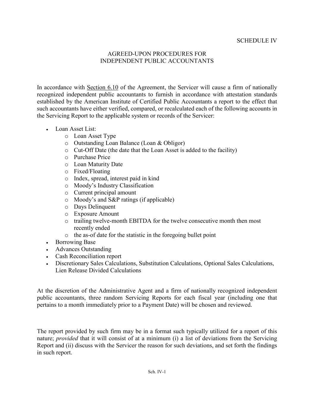 Sch. IV-1 SCHEDULE IV AGREED-UPON PROCEDURES FOR INDEPENDENT PUBLIC ACCOUNTANTS In accordance with Section 6.10 of the Agreement, the Servicer will cause a firm of nationally recognized independent public accountants to furnish in accordance with attestation standards established by the American Institute of Certified Public Accountants a report to the effect that such accountants have either verified, compared, or recalculated each of the following accounts in the Servicing Report to the applicable system or records of the Servicer: • Loan Asset List: o Loan Asset Type o Outstanding Loan Balance (Loan & Obligor) o Cut-Off Date (the date that the Loan Asset is added to the facility) o Purchase Price o Loan Maturity Date o Fixed/Floating o Index, spread, interest paid in kind o Moody’s Industry Classification o Current principal amount o Moody’s and S&P ratings (if applicable) o Days Delinquent o Exposure Amount o trailing twelve-month EBITDA for the twelve consecutive month then most recently ended o the as-of date for the statistic in the foregoing bullet point • Borrowing Base • Advances Outstanding • Cash Reconciliation report • Discretionary Sales Calculations, Substitution Calculations, Optional Sales Calculations, Lien Release Divided Calculations At the discretion of the Administrative Agent and a firm of nationally recognized independent public accountants, three random Servicing Reports for each fiscal year (including one that pertains to a month immediately prior to a Payment Date) will be chosen and reviewed. The report provided by such firm may be in a format such typically utilized for a report of this nature; provided that it will consist of at a minimum (i) a list of deviations from the Servicing Report and (ii) discuss with the Servicer the reason for such deviations, and set forth the findings in such report.