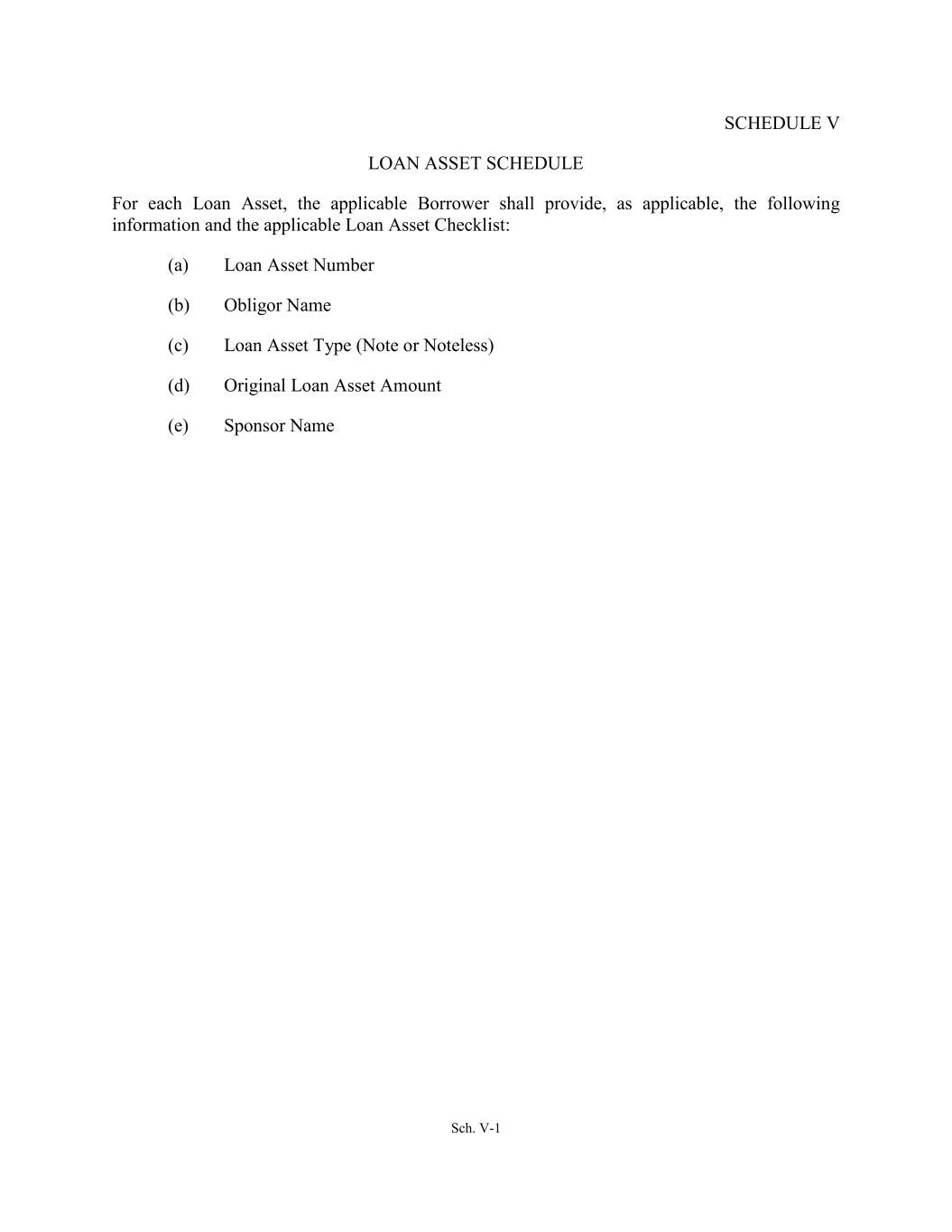Sch. V-1 SCHEDULE V LOAN ASSET SCHEDULE For each Loan Asset, the applicable Borrower shall provide, as applicable, the following information and the applicable Loan Asset Checklist: (a) Loan Asset Number (b) Obligor Name (c) Loan Asset Type (Note or Noteless) (d) Original Loan Asset Amount (e) Sponsor Name