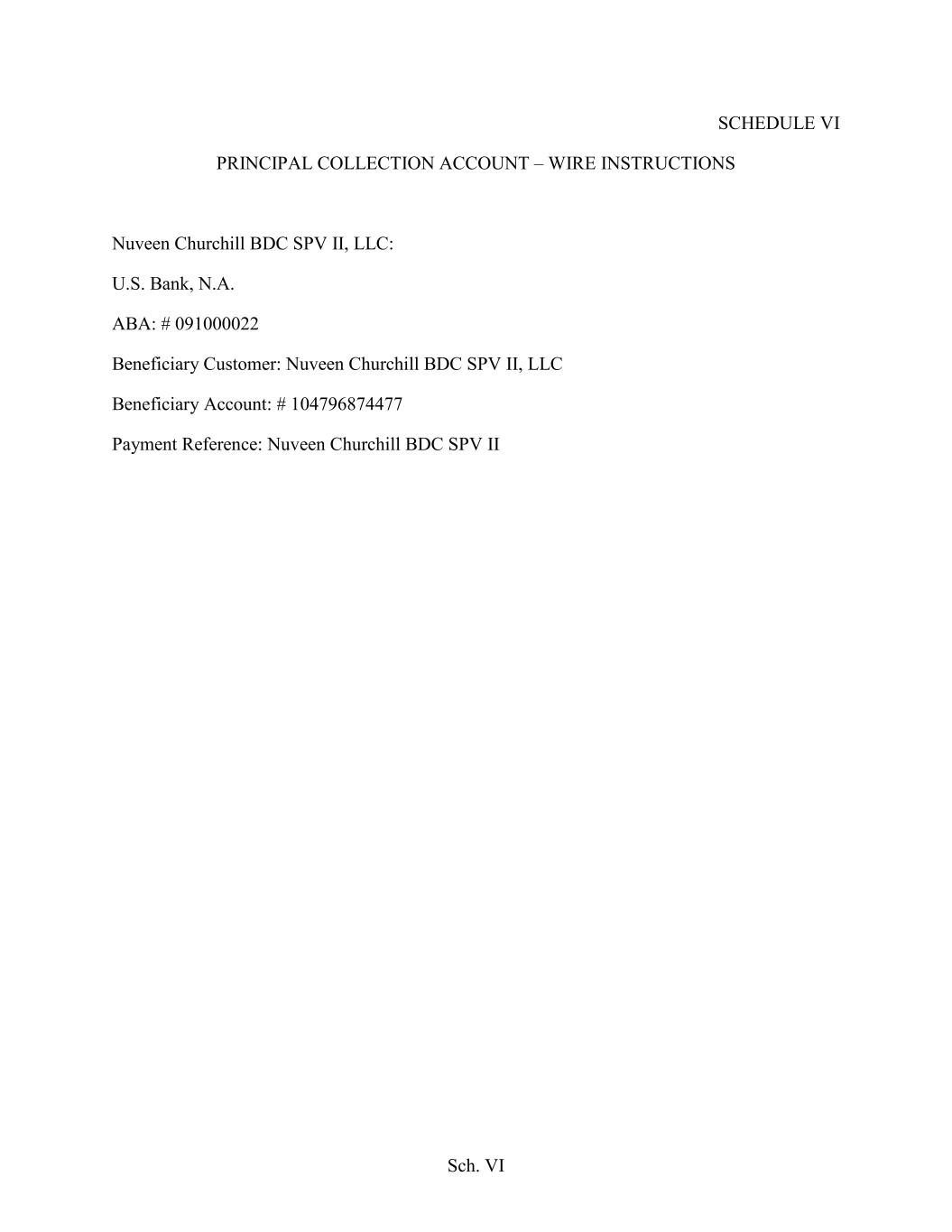 Sch. VI SCHEDULE VI PRINCIPAL COLLECTION ACCOUNT – WIRE INSTRUCTIONS Nuveen Churchill BDC SPV II, LLC: U.S. Bank, N.A. ABA: # 091000022 Beneficiary Customer: Nuveen Churchill BDC SPV II, LLC Beneficiary Account: # 104796874477 Payment Reference: Nuveen Churchill BDC SPV II