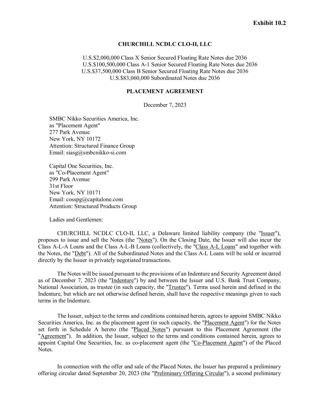 Exhibit 10.2 CHURCHILL NCDLC CLO-II, LLC U.S.$2,000,000 Class X Senior Secured Floating Rate Notes due 2036 U.S.$100,500,000 Class A-1 Senior Secured Floating Rate Notes due 2036 U.S.$37,500,000 Class B Senior Secured Floating Rate Notes due 2036 U.S.$83,060,000 Subordinated Notes due 2036 PLACEMENT AGREEMENT December 7, 2023 SMBC Nikko Securities America, Inc. as "Placement Agent" 277 Park Avenue New York, NY 10172 Attention: Structured Finance Group Email: siasg@smbcnikko-si.com Capital One Securities, Inc. as "Co-Placement Agent" 299 Park Avenue 31st Floor New York, NY 10171 Email: cosspg@capitalone.com Attention: Structured Products Group Ladies and Gentlemen: CHURCHILL NCDLC CLO-II, LLC, a Delaware limited liability company (the "Issuer"), proposes to issue and sell the Notes (the "Notes"). On the Closing Date, the Issuer will also incur the Class A-L-A Loans and the Class A-L-B Loans (collectively, the "Class A-L Loans" and together with the Notes, the "Debt"). All of the Subordinated Notes and the Class A-L Loans will be sold or incurred directly by the Issuer in privately negotiated transactions. The Notes will be issued pursuant to the provisions of an Indenture and Security Agreement dated as of December 7, 2023 (the "Indenture") by and between the Issuer and U.S. Bank Trust Company, National Association, as trustee (in such capacity, the "Trustee"). Terms used herein and defined in the Indenture, but which are not otherwise defined herein, shall have the respective meanings given to such terms in the Indenture. The Issuer, subject to the terms and conditions contained herein, agrees to appoint SMBC Nikko Securities America, Inc. as the placement agent (in such capacity, the "Placement Agent") for the Notes set forth in Schedule A hereto (the "Placed Notes") pursuant to this Placement Agreement (the "Agreement"). In addition, the Issuer, subject to the terms and conditions contained herein, agrees to appoint Capital One Securities, Inc. as co-placement agent (the "Co-Placement Agent") of the Placed Notes. In connection with the offer and sale of the Placed Notes, the Issuer has prepared a preliminary offering circular dated September 20, 2023 (the "Preliminary Offering Circular"), a second preliminary