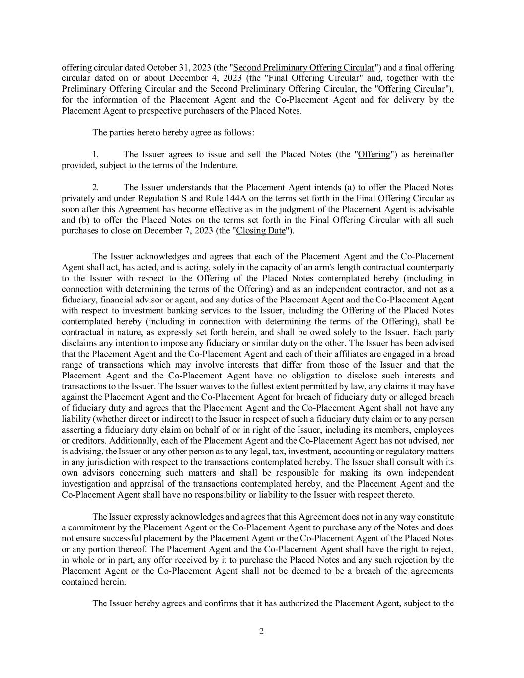 2 offering circular dated October 31, 2023 (the "Second Preliminary Offering Circular") and a final offering circular dated on or about December 4, 2023 (the "Final Offering Circular" and, together with the Preliminary Offering Circular and the Second Preliminary Offering Circular, the "Offering Circular"), for the information of the Placement Agent and the Co-Placement Agent and for delivery by the Placement Agent to prospective purchasers of the Placed Notes. The parties hereto hereby agree as follows: 1. The Issuer agrees to issue and sell the Placed Notes (the "Offering") as hereinafter provided, subject to the terms of the Indenture. 2. The Issuer understands that the Placement Agent intends (a) to offer the Placed Notes privately and under Regulation S and Rule 144A on the terms set forth in the Final Offering Circular as soon after this Agreement has become effective as in the judgment of the Placement Agent is advisable and (b) to offer the Placed Notes on the terms set forth in the Final Offering Circular with all such purchases to close on December 7, 2023 (the "Closing Date"). The Issuer acknowledges and agrees that each of the Placement Agent and the Co-Placement Agent shall act, has acted, and is acting, solely in the capacity of an arm's length contractual counterparty to the Issuer with respect to the Offering of the Placed Notes contemplated hereby (including in connection with determining the terms of the Offering) and as an independent contractor, and not as a fiduciary, financial advisor or agent, and any duties of the Placement Agent and the Co-Placement Agent with respect to investment banking services to the Issuer, including the Offering of the Placed Notes contemplated hereby (including in connection with determining the terms of the Offering), shall be contractual in nature, as expressly set forth herein, and shall be owed solely to the Issuer. Each party disclaims any intention to impose any fiduciary or similar duty on the other. The Issuer has been advised that the Placement Agent and the Co-Placement Agent and each of their affiliates are engaged in a broad range of transactions which may involve interests that differ from those of the Issuer and that the Placement Agent and the Co-Placement Agent have no obligation to disclose such interests and transactions to the Issuer. The Issuer waives to the fullest extent permitted by law, any claims it may have against the Placement Agent and the Co-Placement Agent for breach of fiduciary duty or alleged breach of fiduciary duty and agrees that the Placement Agent and the Co-Placement Agent shall not have any liability (whether direct or indirect) to the Issuer in respect of such a fiduciary duty claim or to any person asserting a fiduciary duty claim on behalf of or in right of the Issuer, including its members, employees or creditors. Additionally, each of the Placement Agent and the Co-Placement Agent has not advised, nor is advising, the Issuer or any other person as to any legal, tax, investment, accounting or regulatory matters in any jurisdiction with respect to the transactions contemplated hereby. The Issuer shall consult with its own advisors concerning such matters and shall be responsible for making its own independent investigation and appraisal of the transactions contemplated hereby, and the Placement Agent and the Co-Placement Agent shall have no responsibility or liability to the Issuer with respect thereto. The Issuer expressly acknowledges and agrees that this Agreement does not in any way constitute a commitment by the Placement Agent or the Co-Placement Agent to purchase any of the Notes and does not ensure successful placement by the Placement Agent or the Co-Placement Agent of the Placed Notes or any portion thereof. The Placement Agent and the Co-Placement Agent shall have the right to reject, in whole or in part, any offer received by it to purchase the Placed Notes and any such rejection by the Placement Agent or the Co-Placement Agent shall not be deemed to be a breach of the agreements contained herein. The Issuer hereby agrees and confirms that it has authorized the Placement Agent, subject to the
