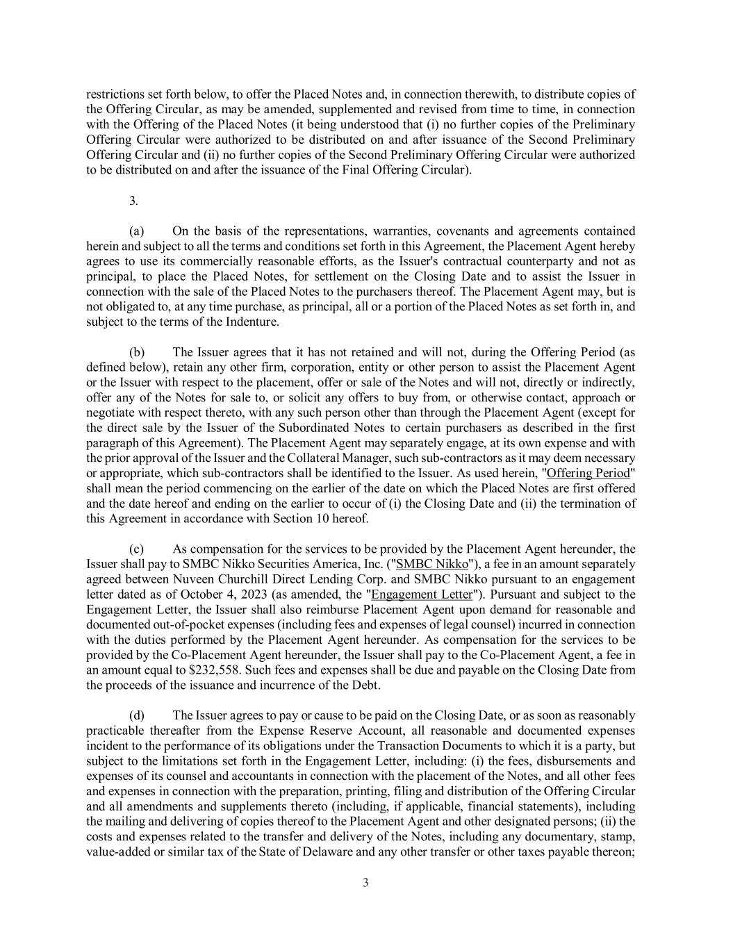3 restrictions set forth below, to offer the Placed Notes and, in connection therewith, to distribute copies of the Offering Circular, as may be amended, supplemented and revised from time to time, in connection with the Offering of the Placed Notes (it being understood that (i) no further copies of the Preliminary Offering Circular were authorized to be distributed on and after issuance of the Second Preliminary Offering Circular and (ii) no further copies of the Second Preliminary Offering Circular were authorized to be distributed on and after the issuance of the Final Offering Circular). 3. (a) On the basis of the representations, warranties, covenants and agreements contained herein and subject to all the terms and conditions set forth in this Agreement, the Placement Agent hereby agrees to use its commercially reasonable efforts, as the Issuer's contractual counterparty and not as principal, to place the Placed Notes, for settlement on the Closing Date and to assist the Issuer in connection with the sale of the Placed Notes to the purchasers thereof. The Placement Agent may, but is not obligated to, at any time purchase, as principal, all or a portion of the Placed Notes as set forth in, and subject to the terms of the Indenture. (b) The Issuer agrees that it has not retained and will not, during the Offering Period (as defined below), retain any other firm, corporation, entity or other person to assist the Placement Agent or the Issuer with respect to the placement, offer or sale of the Notes and will not, directly or indirectly, offer any of the Notes for sale to, or solicit any offers to buy from, or otherwise contact, approach or negotiate with respect thereto, with any such person other than through the Placement Agent (except for the direct sale by the Issuer of the Subordinated Notes to certain purchasers as described in the first paragraph of this Agreement). The Placement Agent may separately engage, at its own expense and with the prior approval of the Issuer and the Collateral Manager, such sub-contractors as it may deem necessary or appropriate, which sub-contractors shall be identified to the Issuer. As used herein, "Offering Period" shall mean the period commencing on the earlier of the date on which the Placed Notes are first offered and the date hereof and ending on the earlier to occur of (i) the Closing Date and (ii) the termination of this Agreement in accordance with Section 10 hereof. (c) As compensation for the services to be provided by the Placement Agent hereunder, the Issuer shall pay to SMBC Nikko Securities America, Inc. ("SMBC Nikko"), a fee in an amount separately agreed between Nuveen Churchill Direct Lending Corp. and SMBC Nikko pursuant to an engagement letter dated as of October 4, 2023 (as amended, the "Engagement Letter"). Pursuant and subject to the Engagement Letter, the Issuer shall also reimburse Placement Agent upon demand for reasonable and documented out-of-pocket expenses (including fees and expenses of legal counsel) incurred in connection with the duties performed by the Placement Agent hereunder. As compensation for the services to be provided by the Co-Placement Agent hereunder, the Issuer shall pay to the Co-Placement Agent, a fee in an amount equal to $232,558. Such fees and expenses shall be due and payable on the Closing Date from the proceeds of the issuance and incurrence of the Debt. (d) The Issuer agrees to pay or cause to be paid on the Closing Date, or as soon as reasonably practicable thereafter from the Expense Reserve Account, all reasonable and documented expenses incident to the performance of its obligations under the Transaction Documents to which it is a party, but subject to the limitations set forth in the Engagement Letter, including: (i) the fees, disbursements and expenses of its counsel and accountants in connection with the placement of the Notes, and all other fees and expenses in connection with the preparation, printing, filing and distribution of the Offering Circular and all amendments and supplements thereto (including, if applicable, financial statements), including the mailing and delivering of copies thereof to the Placement Agent and other designated persons; (ii) the costs and expenses related to the transfer and delivery of the Notes, including any documentary, stamp, value-added or similar tax of the State of Delaware and any other transfer or other taxes payable thereon;
