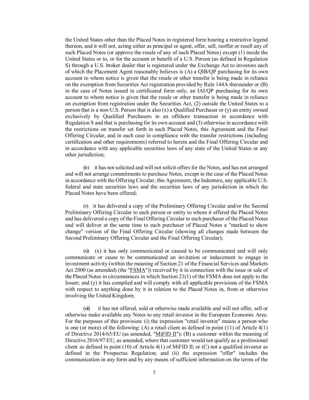 5 the United States other than the Placed Notes in registered form bearing a restrictive legend thereon, and it will not, acting either as principal or agent, offer, sell, reoffer or resell any of such Placed Notes (or approve the resale of any of such Placed Notes) except (1) inside the United States or to, or for the account or benefit of a U.S. Person (as defined in Regulation S) through a U.S. broker dealer that is registered under the Exchange Act to investors each of which the Placement Agent reasonably believes is (A) a QIB/QP purchasing for its own account to whom notice is given that the resale or other transfer is being made in reliance on the exemption from Securities Act registration provided by Rule 144A thereunder or (B) in the case of Notes issued in certificated form only, an IAI/QP purchasing for its own account to whom notice is given that the resale or other transfer is being made in reliance on exemption from registration under the Securities Act, (2) outside the United States to a person that is a non-U.S. Person that is also (x) a Qualified Purchaser or (y) an entity owned exclusively by Qualified Purchasers in an offshore transaction in accordance with Regulation S and that is purchasing for its own account and (3) otherwise in accordance with the restrictions on transfer set forth in such Placed Notes, this Agreement and the Final Offering Circular, and in each case in compliance with the transfer restrictions (including certification and other requirements) referred to herein and the Final Offering Circular and in accordance with any applicable securities laws of any state of the United States or any other jurisdiction; (iv) it has not solicited and will not solicit offers for the Notes, and has not arranged and will not arrange commitments to purchase Notes, except in the case of the Placed Notes in accordance with the Offering Circular, this Agreement, the Indenture, any applicable U.S. federal and state securities laws and the securities laws of any jurisdiction in which the Placed Notes have been offered; (v) it has delivered a copy of the Preliminary Offering Circular and/or the Second Preliminary Offering Circular to each person or entity to whom it offered the Placed Notes and has delivered a copy of the Final Offering Circular to each purchaser of the Placed Notes and will deliver at the same time to each purchaser of Placed Notes a "marked to show change" version of the Final Offering Circular (showing all changes made between the Second Preliminary Offering Circular and the Final Offering Circular); (vi) (x) it has only communicated or caused to be communicated and will only communicate or cause to be communicated an invitation or inducement to engage in investment activity (within the meaning of Section 21 of the Financial Services and Markets Act 2000 (as amended) (the "FSMA")) received by it in connection with the issue or sale of the Placed Notes in circumstances in which Section 21(1) of the FSMA does not apply to the Issuer; and (y) it has complied and will comply with all applicable provisions of the FSMA with respect to anything done by it in relation to the Placed Notes in, from or otherwise involving the United Kingdom; (vii) it has not offered, sold or otherwise made available and will not offer, sell or otherwise make available any Notes to any retail investor in the European Economic Area. For the purposes of this provision: (i) the expression "retail investor" means a person who is one (or more) of the following: (A) a retail client as defined in point (11) of Article 4(1) of Directive 2014/65/EU (as amended, "MiFID II"); (B) a customer within the meaning of Directive 2016/97/EU, as amended, where that customer would not qualify as a professional client as defined in point (10) of Article 4(1) of MiFID II; or (C) not a qualified investor as defined in the Prospectus Regulation; and (ii) the expression "offer" includes the communication in any form and by any means of sufficient information on the terms of the