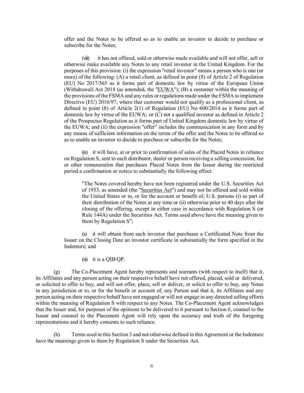 6 offer and the Notes to be offered so as to enable an investor to decide to purchase or subscribe for the Notes; (viii) it has not offered, sold or otherwise made available and will not offer, sell or otherwise make available any Notes to any retail investor in the United Kingdom. For the purposes of this provision: (i) the expression "retail investor" means a person who is one (or more) of the following: (A) a retail client, as defined in point (8) of Article 2 of Regulation (EU) No 2017/565 as it forms part of domestic law by virtue of the European Union (Withdrawal) Act 2018 (as amended, the "EUWA"); (B) a customer within the meaning of the provisions of the FSMA and any rules or regulations made under the FSMA to implement Directive (EU) 2016/97, where that customer would not qualify as a professional client, as defined in point (8) of Article 2(1) of Regulation (EU) No 600/2014 as it forms part of domestic law by virtue of the EUWA; or (C) not a qualified investor as defined in Article 2 of the Prospectus Regulation as it forms part of United Kingdom domestic law by virtue of the EUWA; and (ii) the expression "offer" includes the communication in any form and by any means of sufficient information on the terms of the offer and the Notes to be offered so as to enable an investor to decide to purchase or subscribe for the Notes; (ix) it will have, at or prior to confirmation of sales of the Placed Notes in reliance on Regulation S, sent to each distributor, dealer or person receiving a selling concession, fee or other remuneration that purchases Placed Notes from the Issuer during the restricted period a confirmation or notice to substantially the following effect: "The Notes covered hereby have not been registered under the U.S. Securities Act of 1933, as amended (the "Securities Act") and may not be offered and sold within the United States or to, or for the account or benefit of, U.S. persons (i) as part of their distribution of the Notes at any time or (ii) otherwise prior to 40 days after the closing of the offering, except in either case in accordance with Regulation S (or Rule 144A) under the Securities Act. Terms used above have the meaning given to them by Regulation S"; (x) it will obtain from each investor that purchases a Certificated Note from the Issuer on the Closing Date an investor certificate in substantially the form specified in the Indenture; and (xi) it is a QIB/QP. (g) The Co-Placement Agent hereby represents and warrants (with respect to itself) that it, its Affiliates and any person acting on their respective behalf have not offered, placed, sold or delivered, or solicited to offer to buy, and will not offer, place, sell or deliver, or solicit to offer to buy, any Notes in any jurisdiction or to, or for the benefit or account of, any Person and that it, its Affiliates and any person acting on their respective behalf have not engaged or will not engage in any directed selling efforts within the meaning of Regulation S with respect to any Notes. The Co-Placement Agent acknowledges that the Issuer and, for purposes of the opinions to be delivered to it pursuant to Section 6, counsel to the Issuer and counsel to the Placement Agent will rely upon the accuracy and truth of the foregoing representations and it hereby consents to such reliance. (h) Terms used in this Section 3 and not otherwise defined in this Agreement or the Indenture have the meanings given to them by Regulation S under the Securities Act.